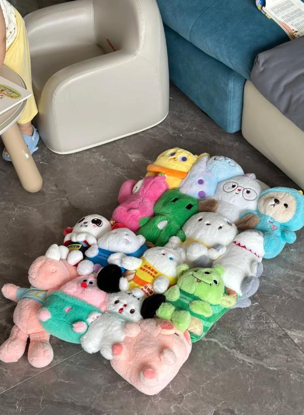 去商場抓來的玩偶,如果太多了不知道收納在哪裏,不如學學這一招,不僅解決了收納難題,而且還diy了“坐墊”!