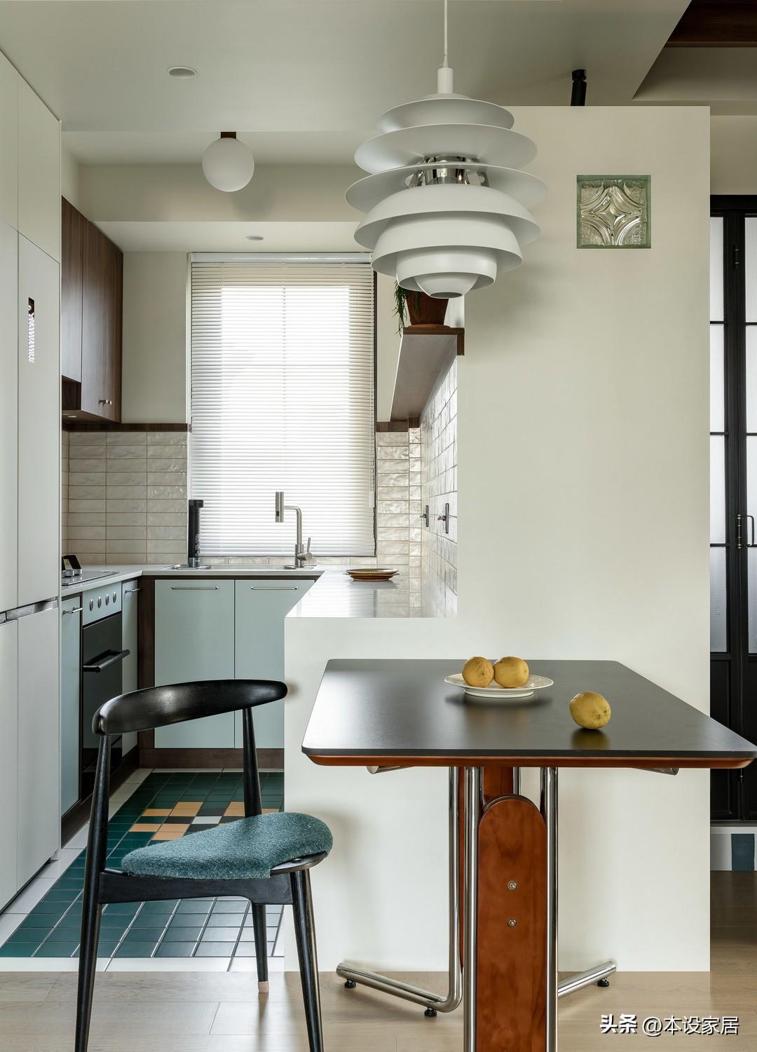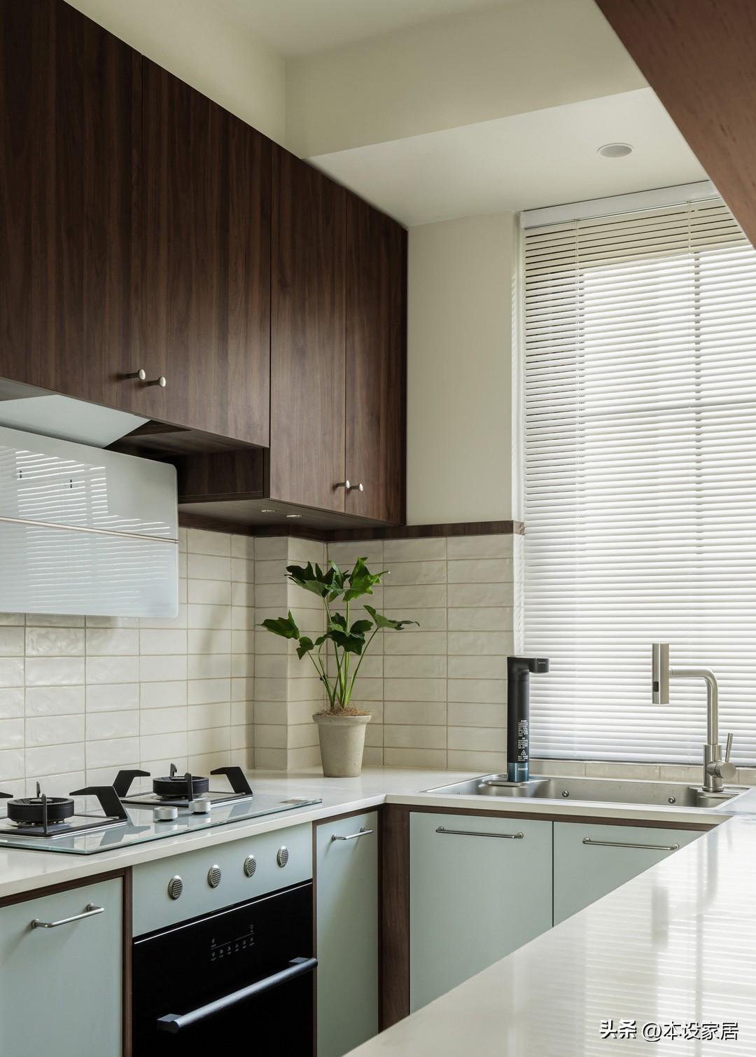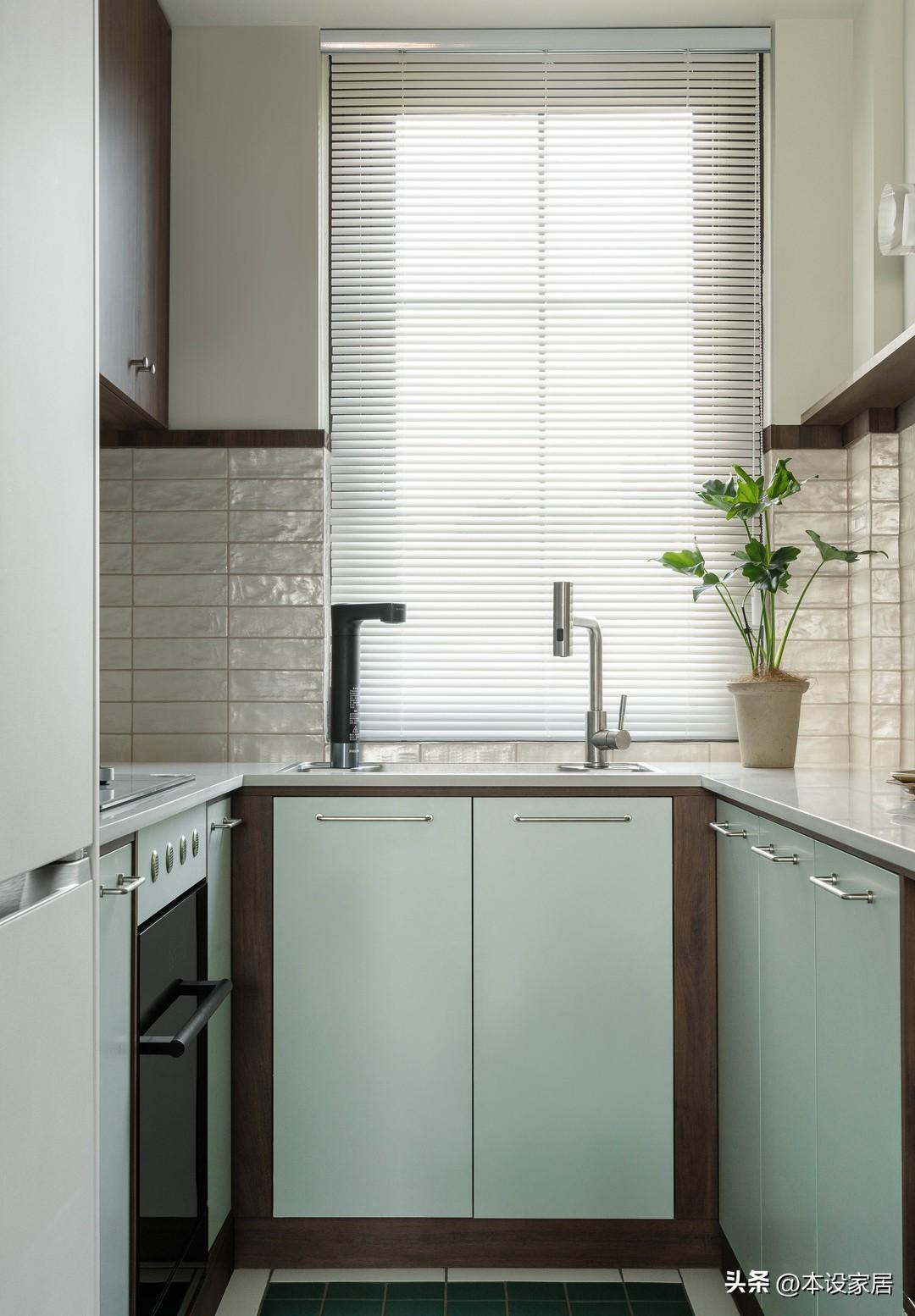 U型的廚房設計,可以容納更多的廚房用品和更大的操作平臺,原木色吊櫃、灰綠色的落地櫃,搭配層板,可以滿足不同物品的收納所需,而整體的淺色調,給人清新明亮的視覺體驗。