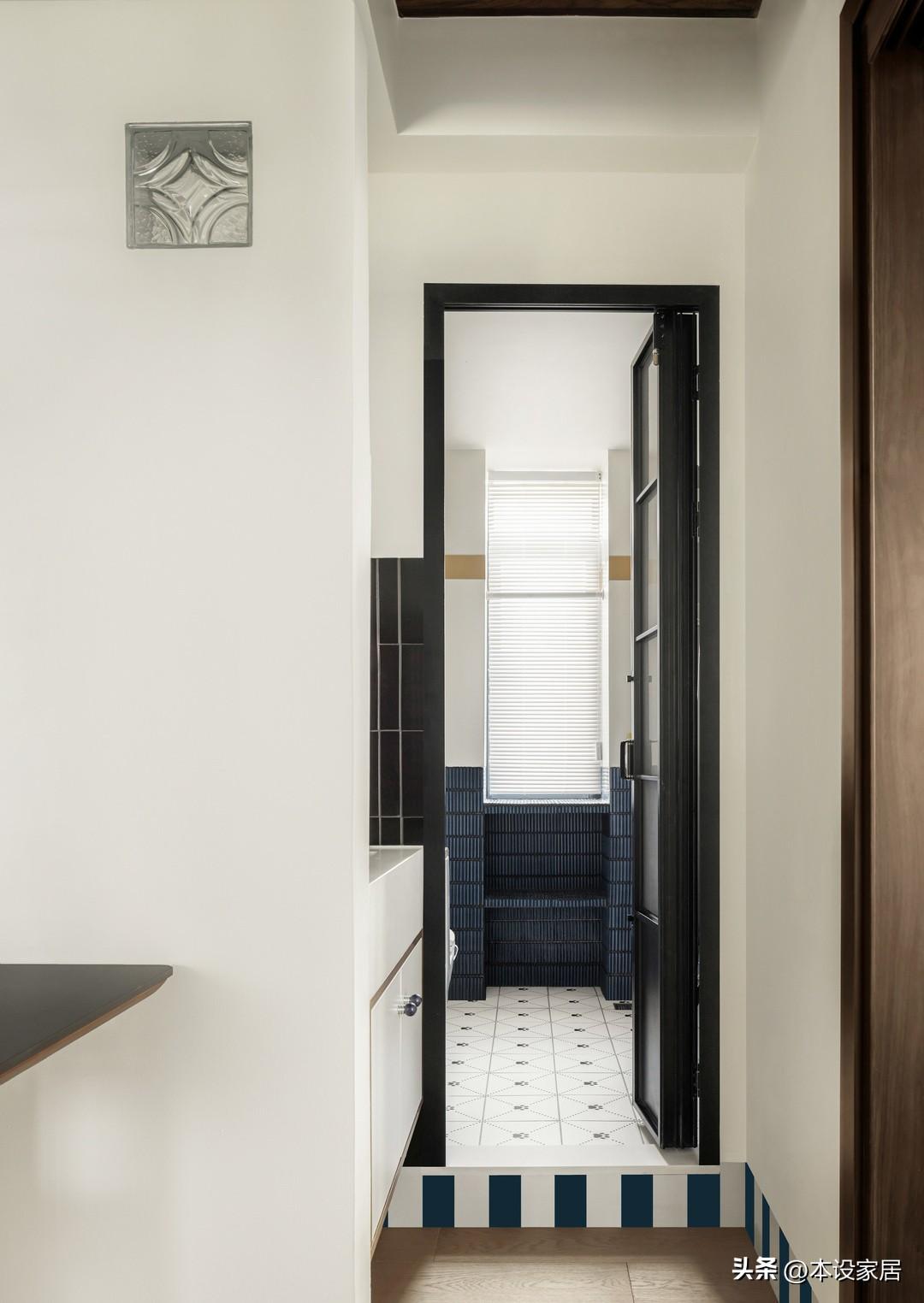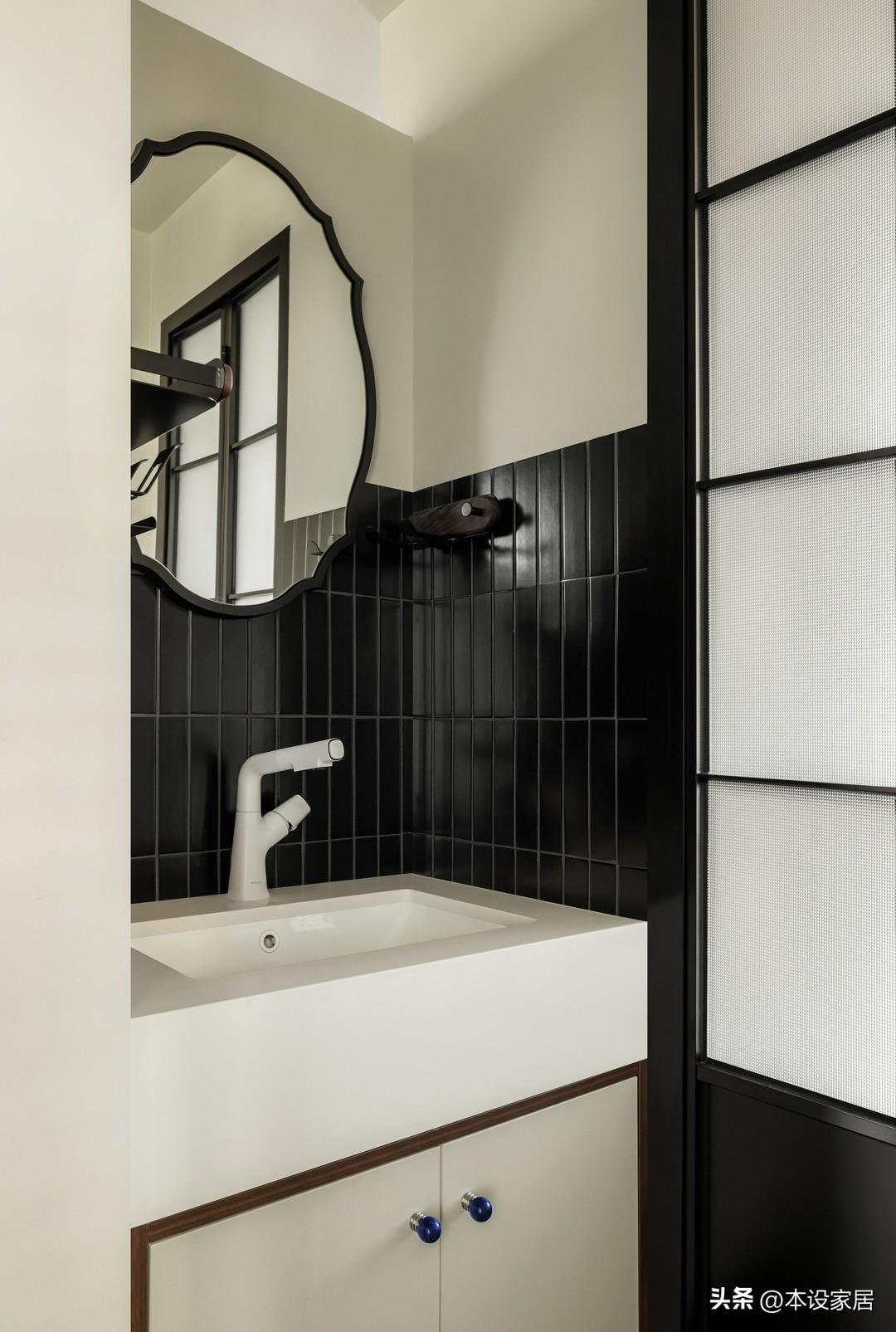 衛生間洗手檯外置,實現乾溼分離,黑白和藍白的撞色搭配,鋪陳出一股清新的氛圍。