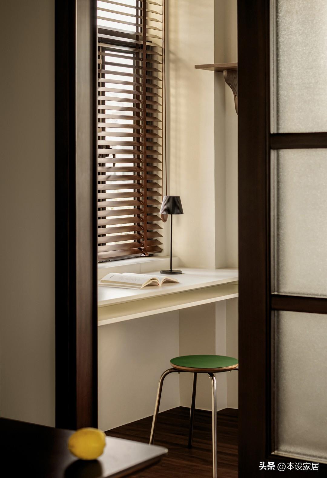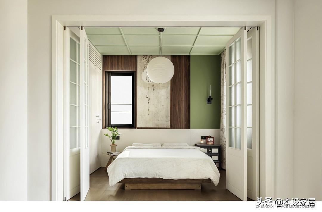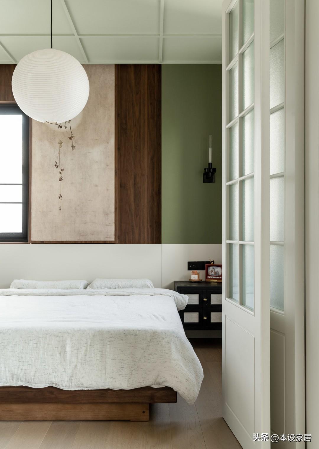 最絕的是臥室改造,素雅的壁畫兼當窗戶,與木質元素和白色宣紙吊燈,營造出淡淡的日式風,讓空間顯得自然又靜謐。