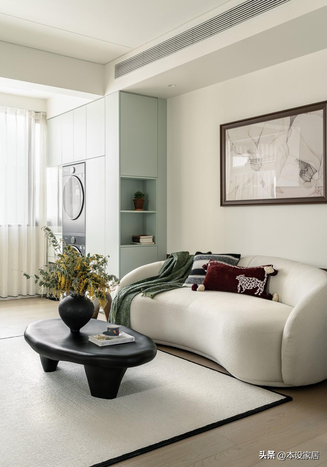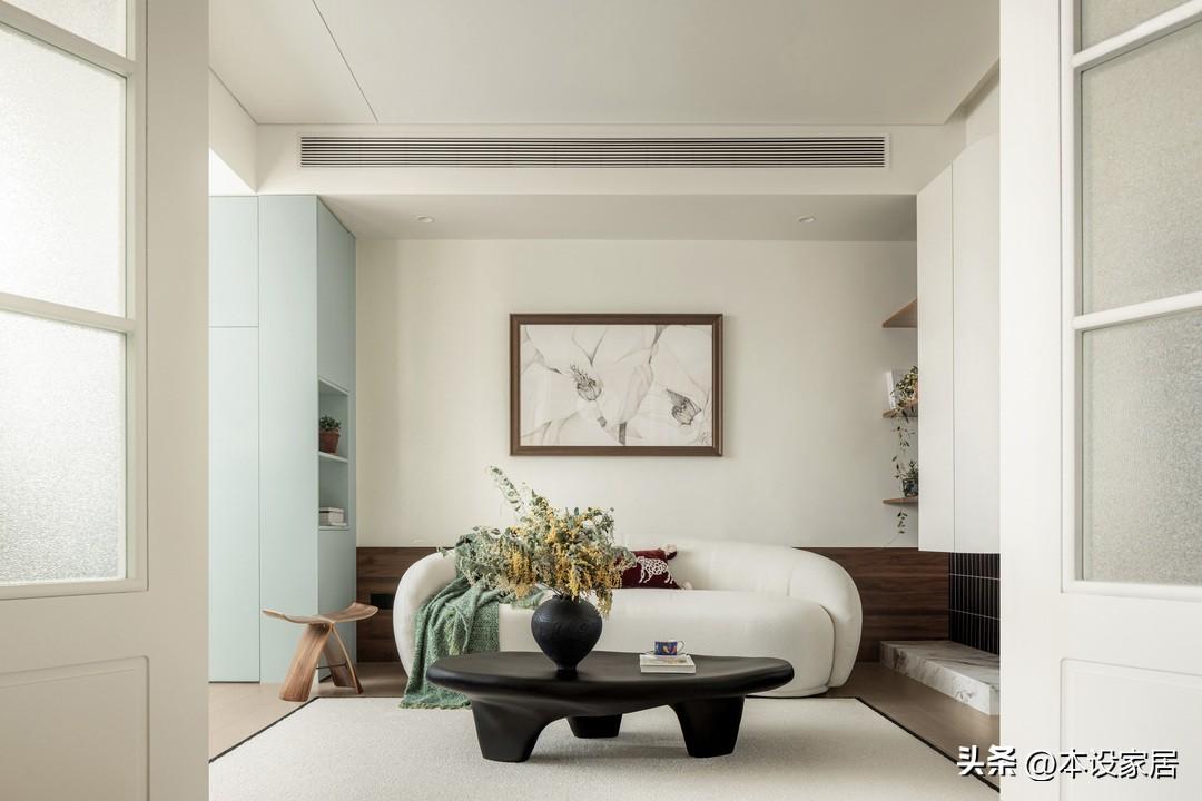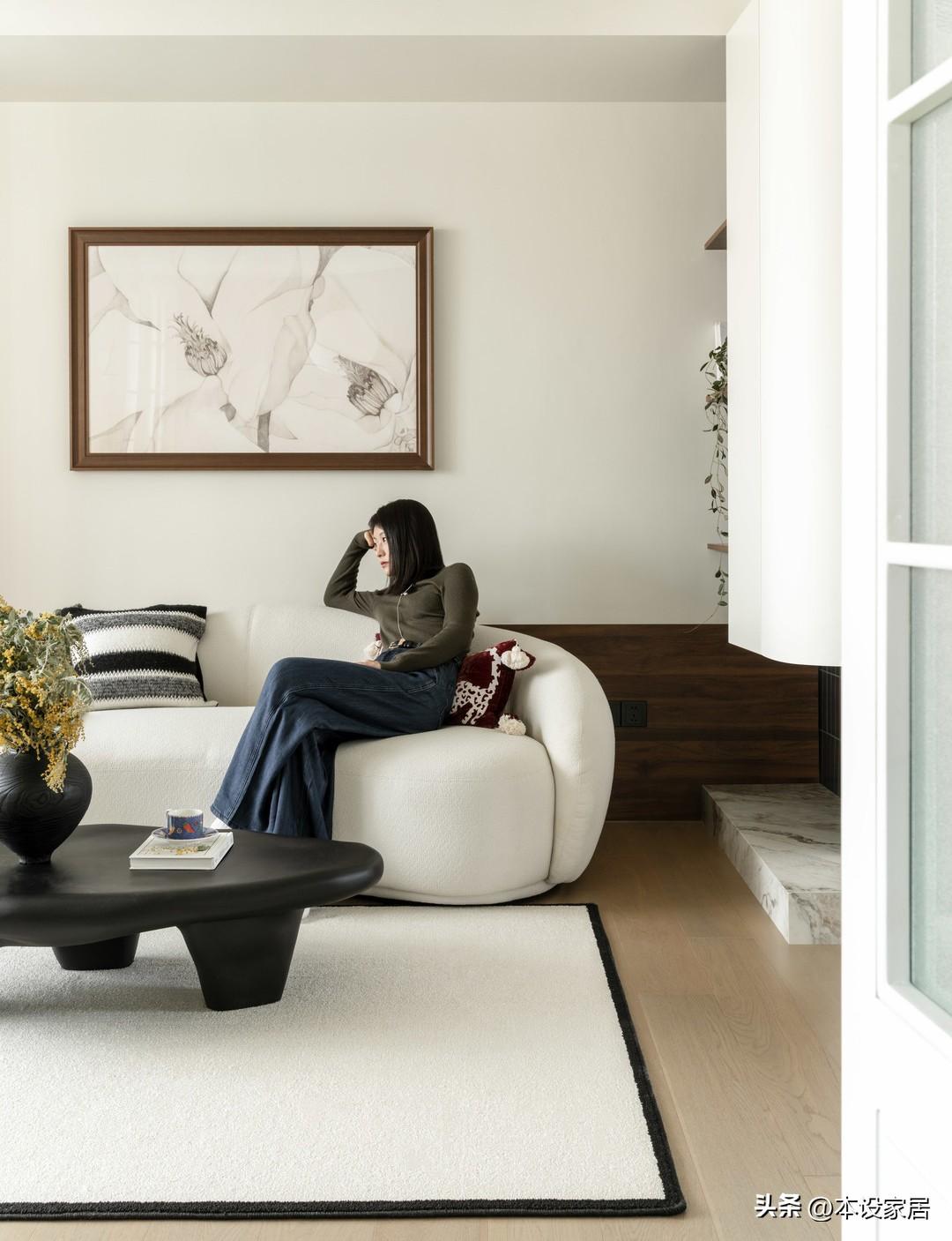 地面鋪設實木地板,搭配大面積的奶白色牆面,整個空間就像一杯溫潤的燕麥奶茶,極致簡約卻舒適到心坎裏,造型柔和的米白色沙發和茶几,在鮮花的點綴下,不經意間營造出一股鬆弛感。