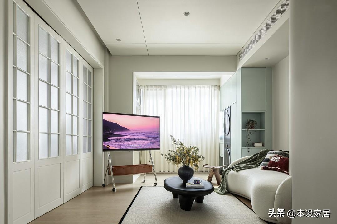 客廳與臥室之間使用磨砂玻璃摺疊門,採光得到優化,視覺也顯大通透。