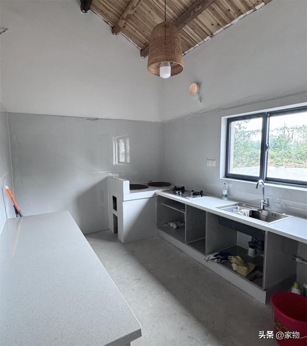 裝修後,雖說還沒來得及安裝油煙機,但卻預留好了安裝位,竈臺、水槽、窗戶都煥然一新,甚至還在角落裏盤了兩個竈臺,用來煮粥燉菜。