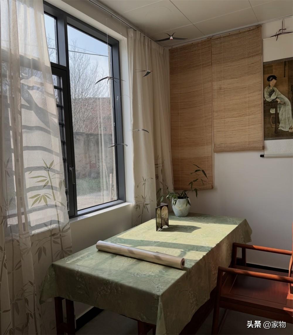 桌椅靠窗採光絕佳,專門留出一個工作、玩耍和練字的地方,桌子的旁邊,也有掛畫掛席和竹子圖案的紗簾,相互搭配下,真有那麼股子文人墨客的雅緻感,比起之前的次臥室,無論是從外觀還是從實用性上,都是質的飛躍。