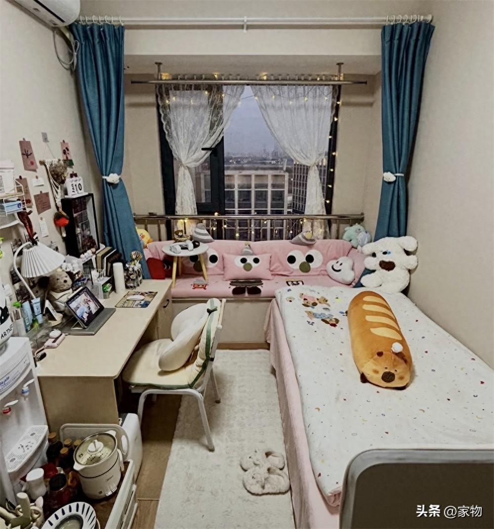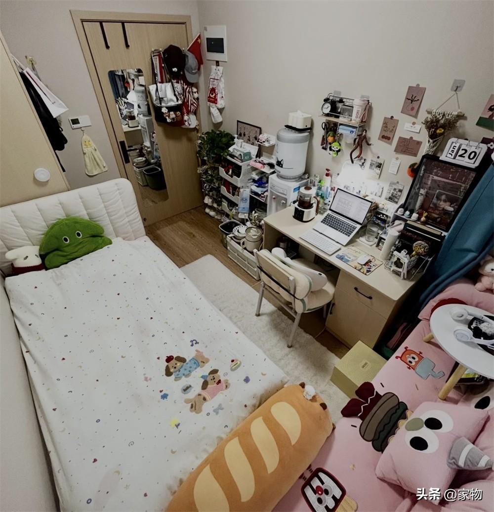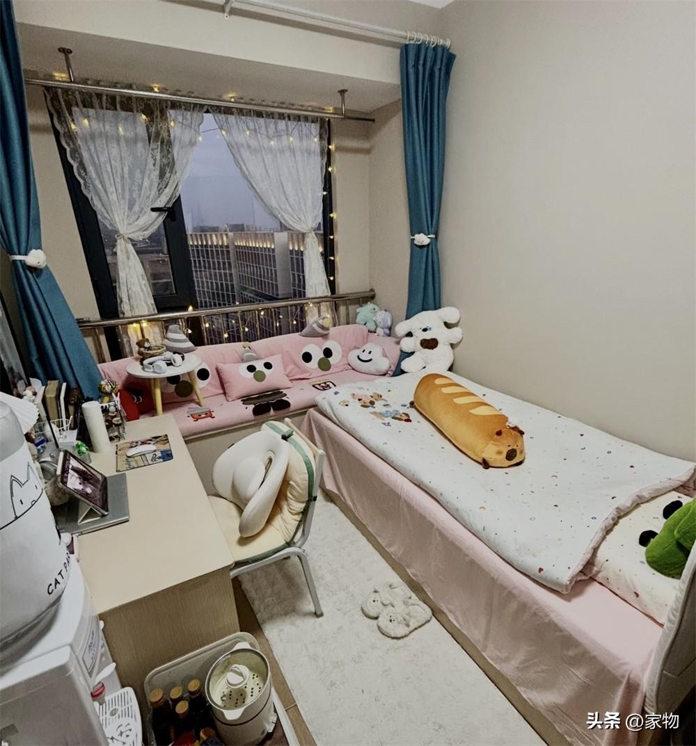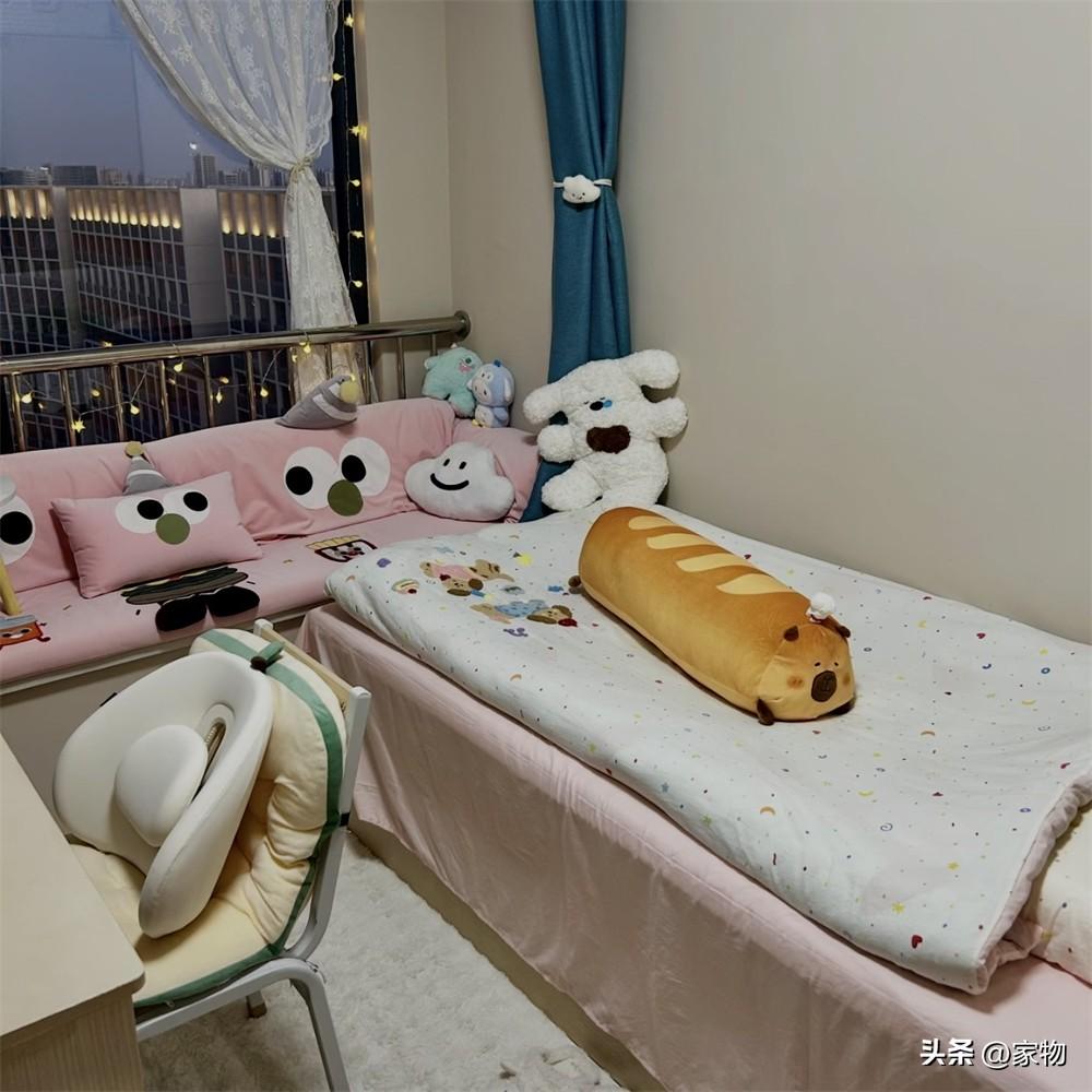 剛住進來的時候,這張單人牀格外簡陋,只有牀架和牀板,遠沒有現在看到的溫馨,但她鋪上牀墊、換了四件套以後,看起來卻有了一個小家的感覺,溫馨可愛、活力滿滿,住着自然也就舒服了許多。