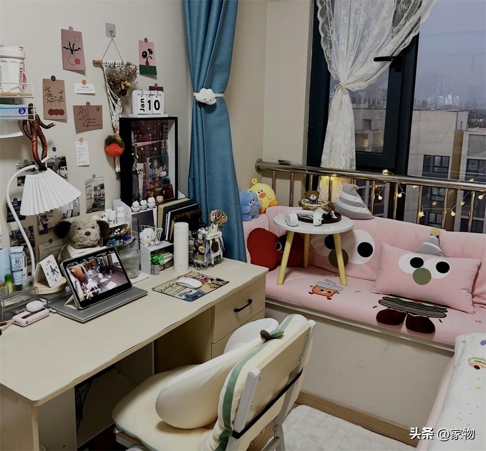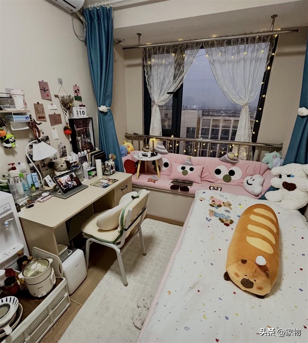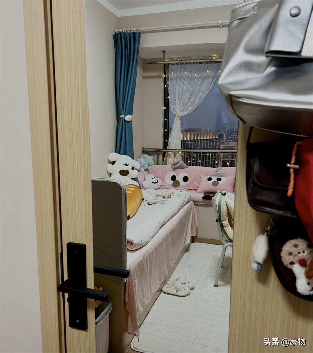 剛住進來的時候,這張單人牀格外簡陋,只有牀架和牀板,遠沒有現在看到的溫馨,但她鋪上牀墊、換了四件套以後,看起來卻有了一個小家的感覺,溫馨可愛、活力滿滿,住着自然也就舒服了許多。