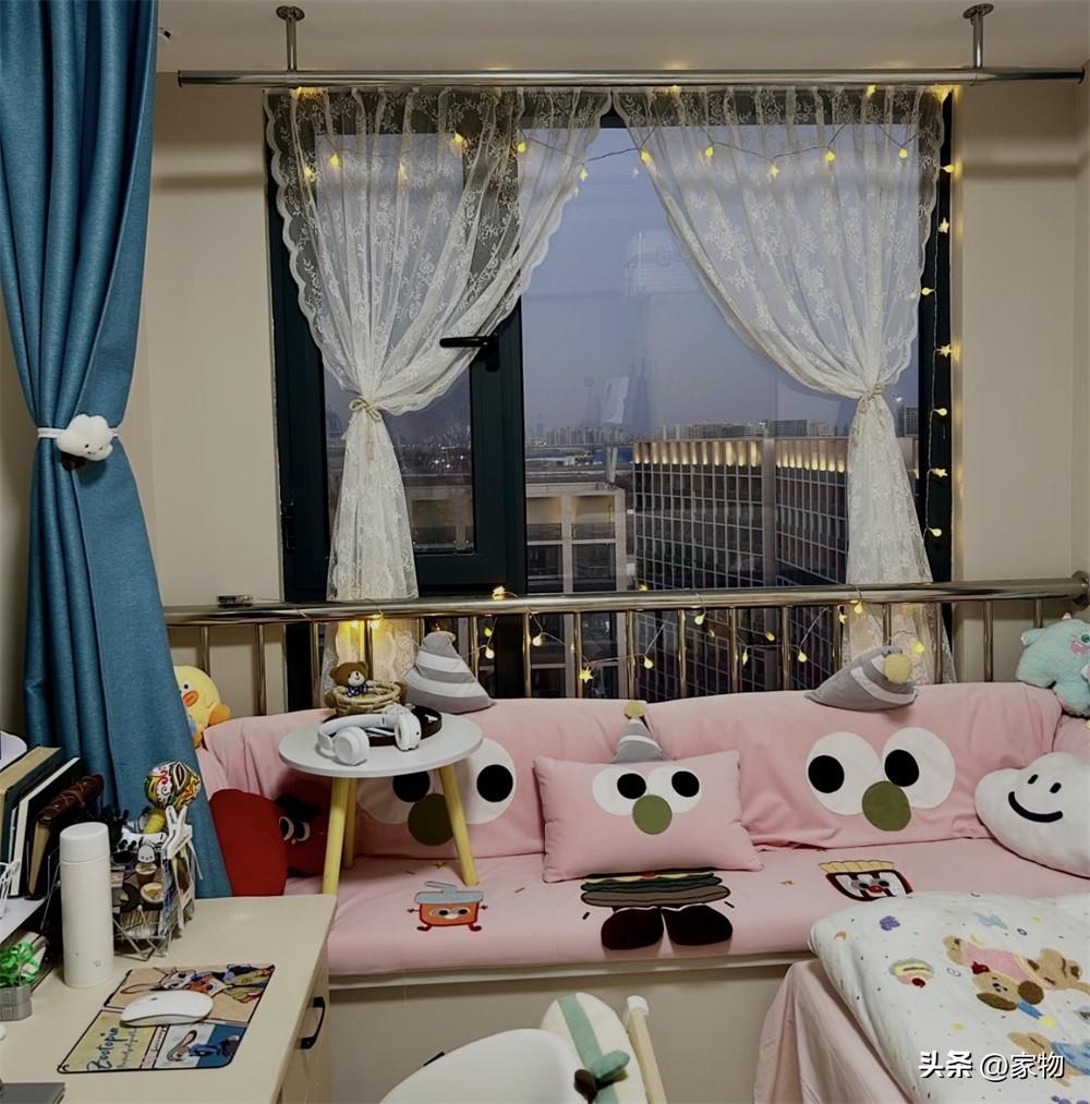 哦對,窗簾是宿舍自帶的,但窗戶上的紗簾和小燈泡是自己加的,也算是爲這平淡無奇的宿舍單間點染一些浪漫氛圍,不得不說,這姑娘是真有想法~