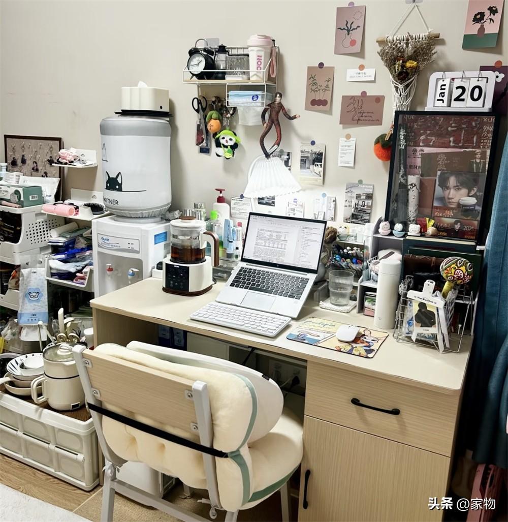 既然是大學單間宿舍,最重要的自然還是學習功能,牀對面的這張學習桌,可以說是經過了她好一番佈置,呈現出現在這樣亂中有序的感覺。