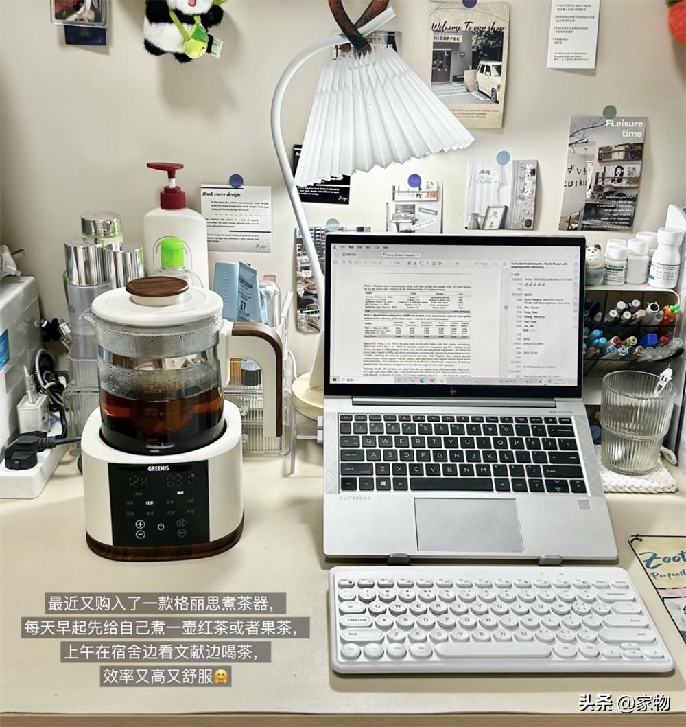 桌面上大部分空間留給電腦和書寫區,僅放上一個養生壺隨時泡茶衝咖啡,冬天的住在裏面也很舒服。