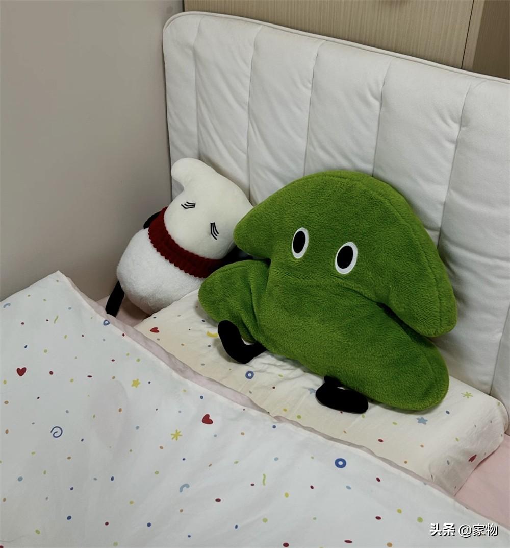 牀上還有很多可愛的毛絨玩具和靠枕,一方面是爲了削減這種單間的冰冷和壓抑感,另一方面,躺在牀上也能多一些柔軟舒適的靠墊,就連牀頭都額外增加了一個卡扣式的牀頭靠背,靠在這裏玩會兒手機、看看書,十分愜意。