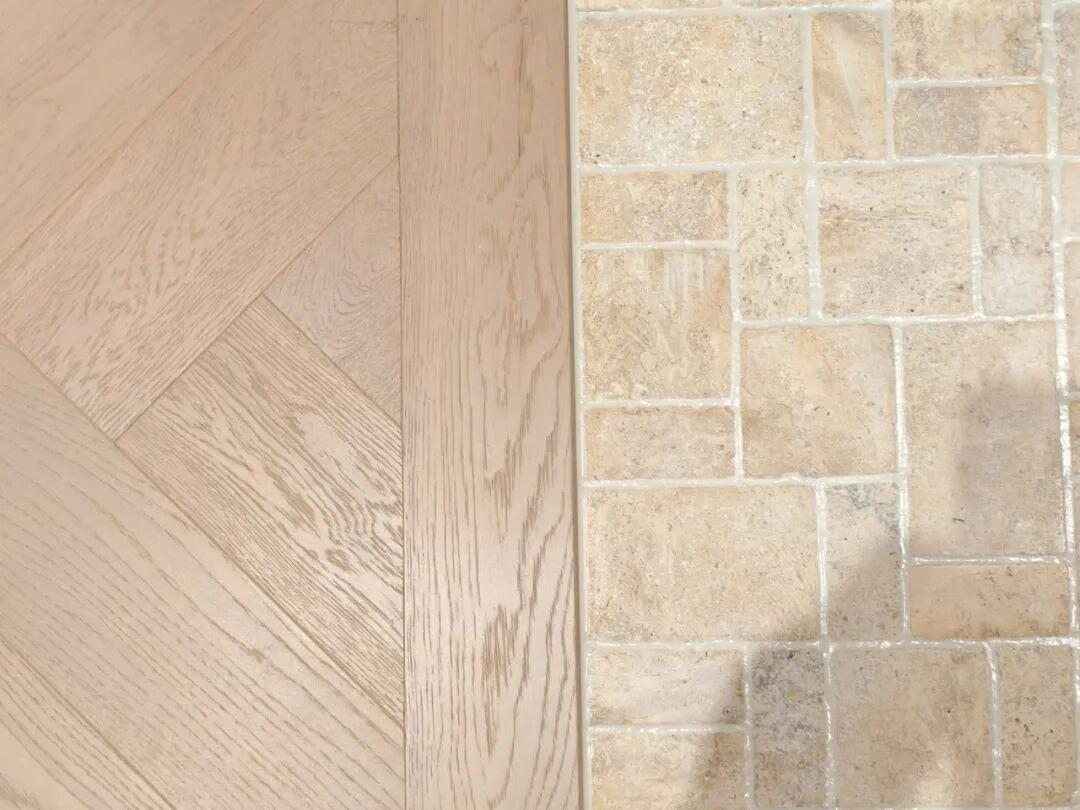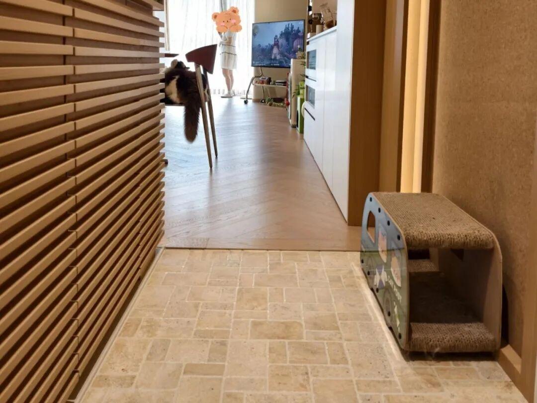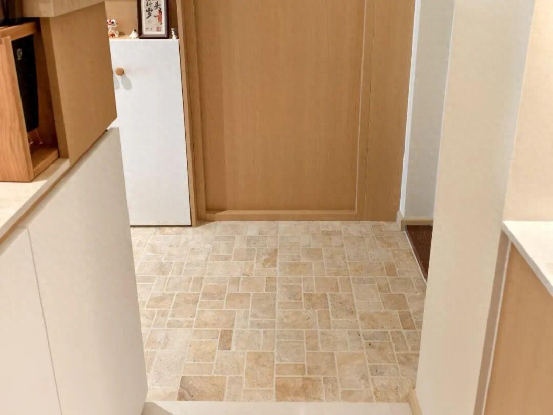 這次裝修,老公執意在玄關入戶的地方,把地面下沉了差不多有四五釐米,而在上面是鋪上了非常利於清潔的花磚。花磚與室內地板形成了差不多兩釐米的高低差。