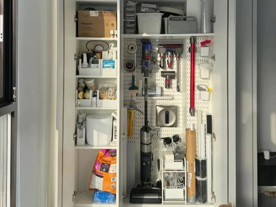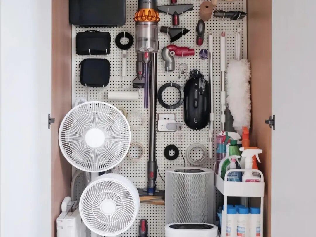而陽臺家政櫃內部工具懸掛區,儘量用洞洞板,可以靈活調整位置,能夠掛更多的工具。