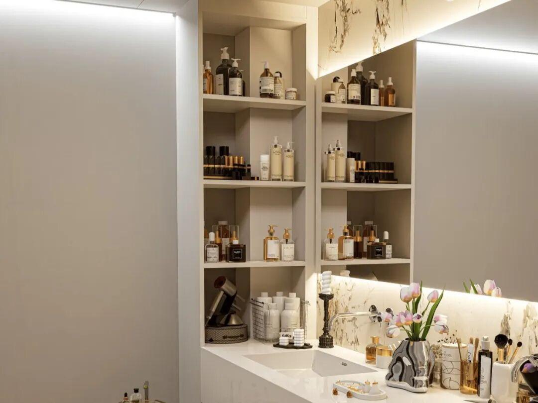 這次裝修,老公把衛生間淋浴區的牆體做了局部的加厚,鑿出來了一個壁龕。同時,還定製了深度25釐米的鏡櫃,內部做的是可調節的隔板,二者做成了一體設計。
