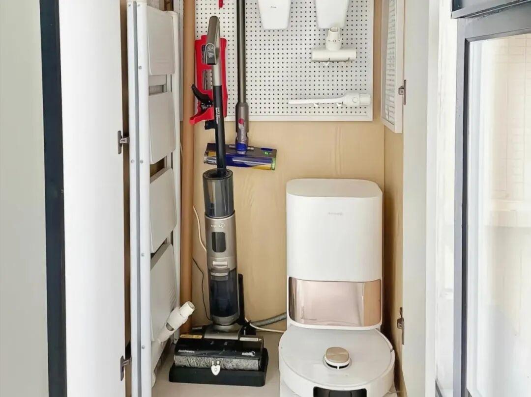 家政櫃的櫃門一關,陽臺就整潔如初了。最讓我驚喜的是,在櫃子裏面還裝了充電插座,吸塵器就再也不用拿出來充電了,非常的省心。