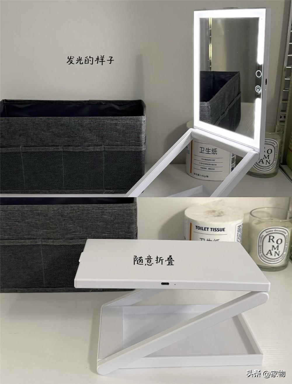 平時摺疊起來薄薄一個,放在抽屜裏或者收納盒裏都不礙事,打開後自帶補光燈,化妝梳洗又能照亮暗區,甚至偶爾當個小夜燈用都可以呢~