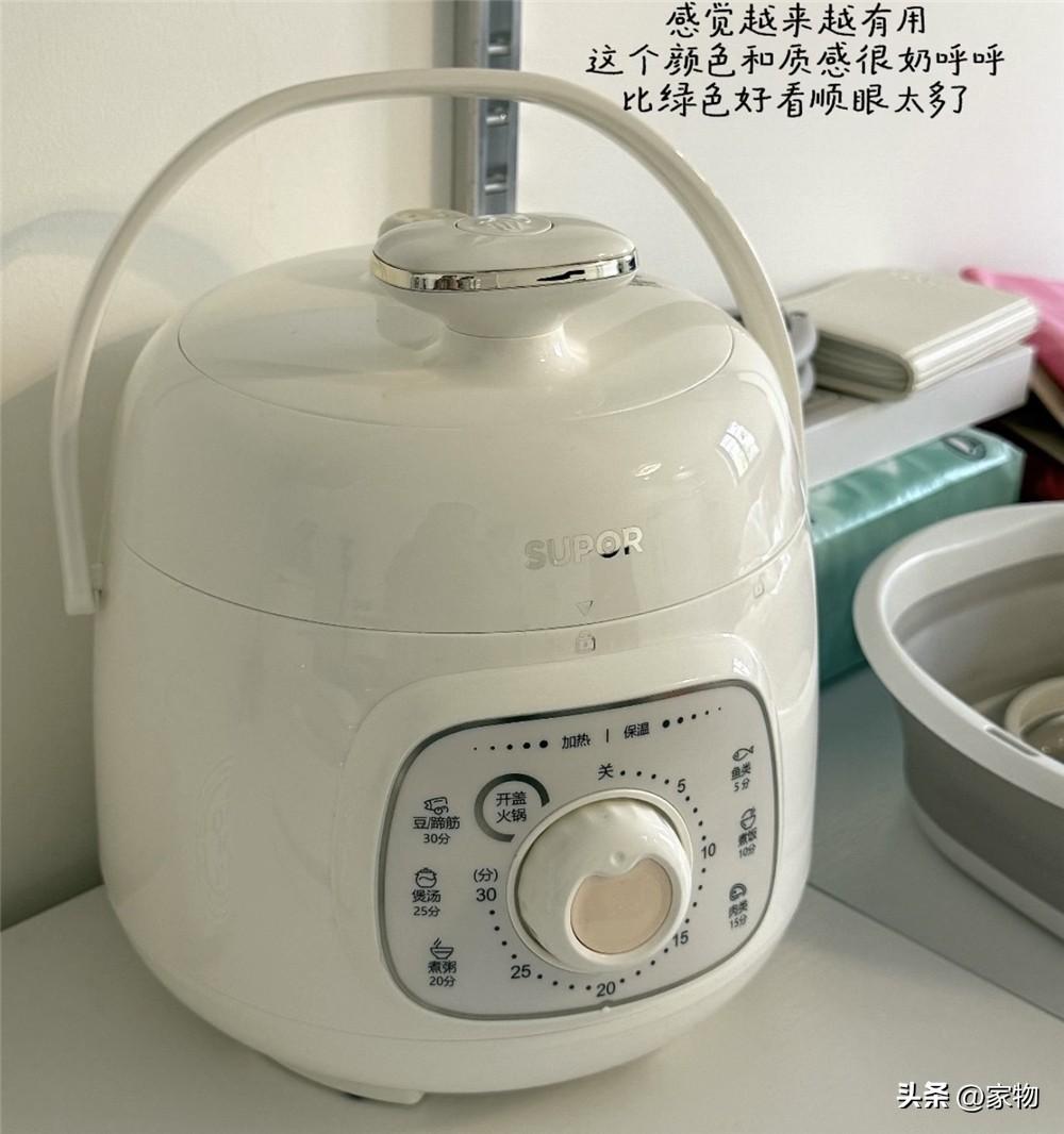 最後就是這個帶提手的小小電飯煲啦~奶呼呼的顏色特別吸引人,而且比起大電飯煲蒸飯更快,又不至於在蒸少量飯的時候讓米飯糊鍋或變硬,手控旋擰按鈕還能讓它兼具熬粥、悶肉菜飯的功能,絕了。