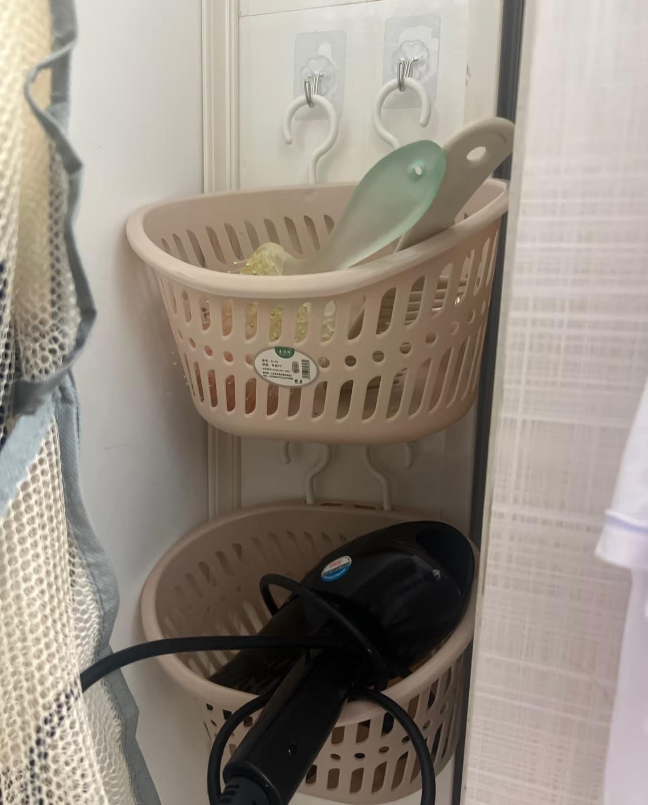 再比如角落收納,掛鉤位置正巧可以掛掛籃,擱個吹風機、梳子等。