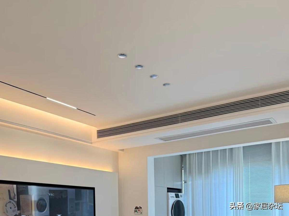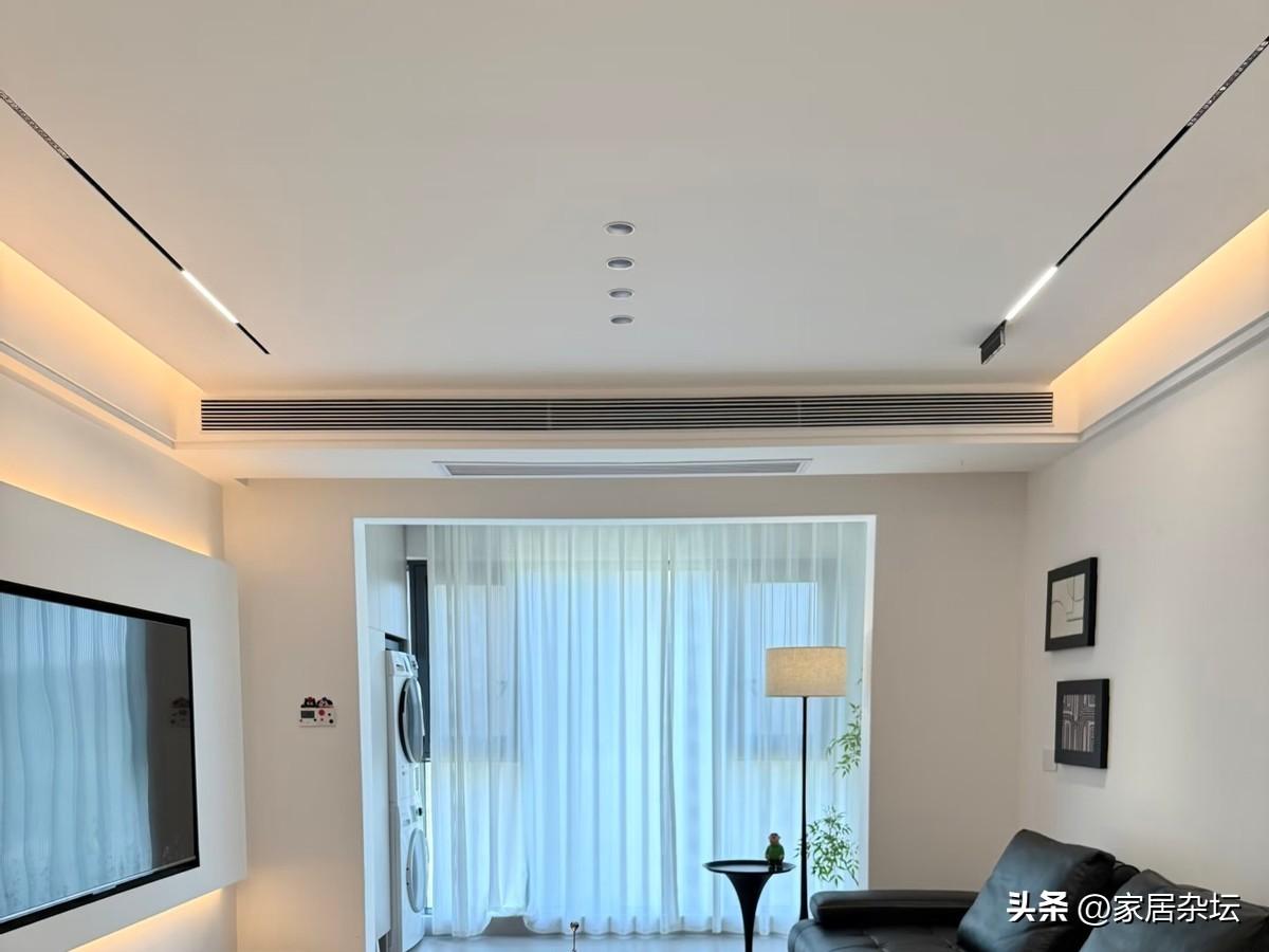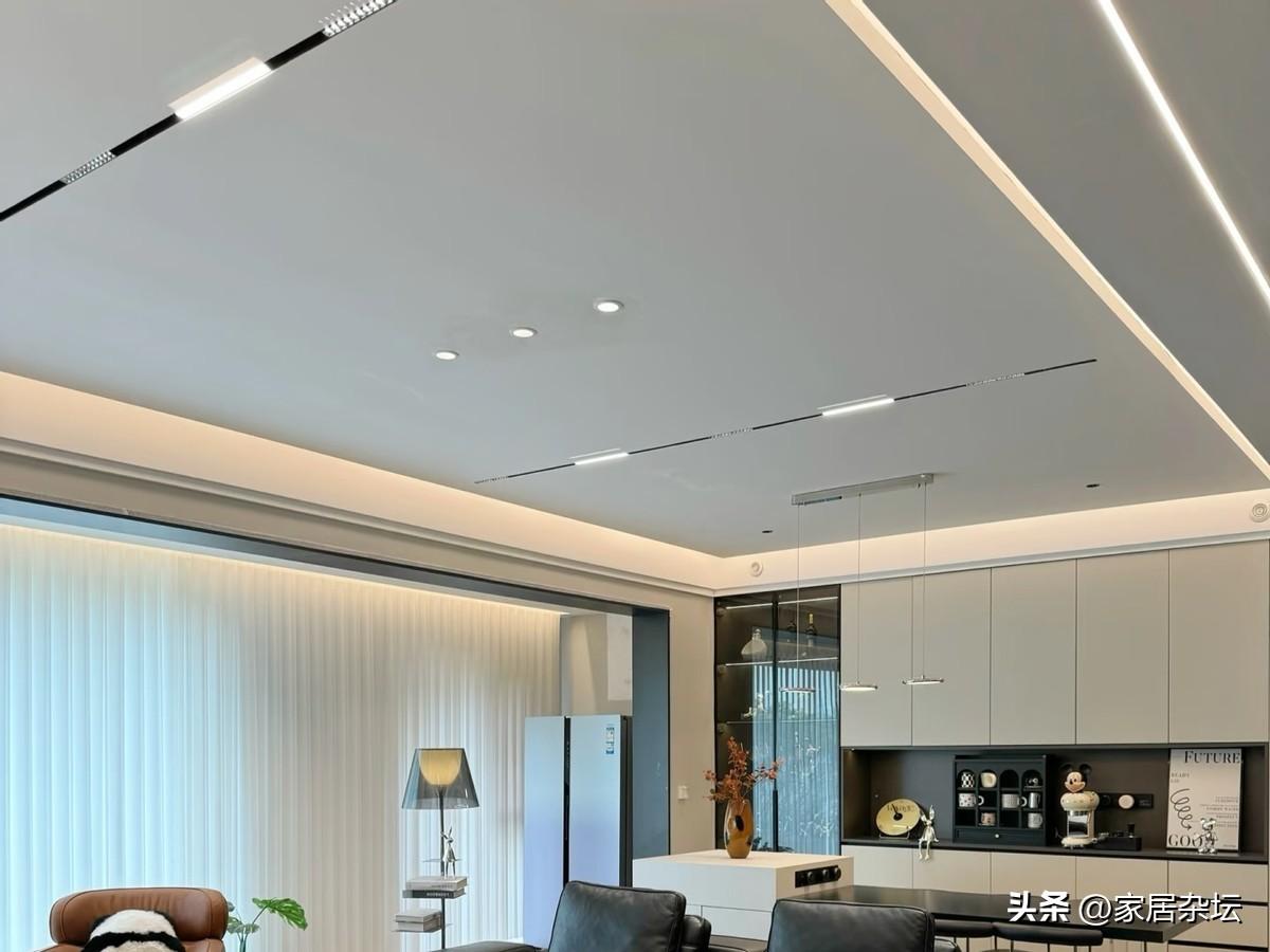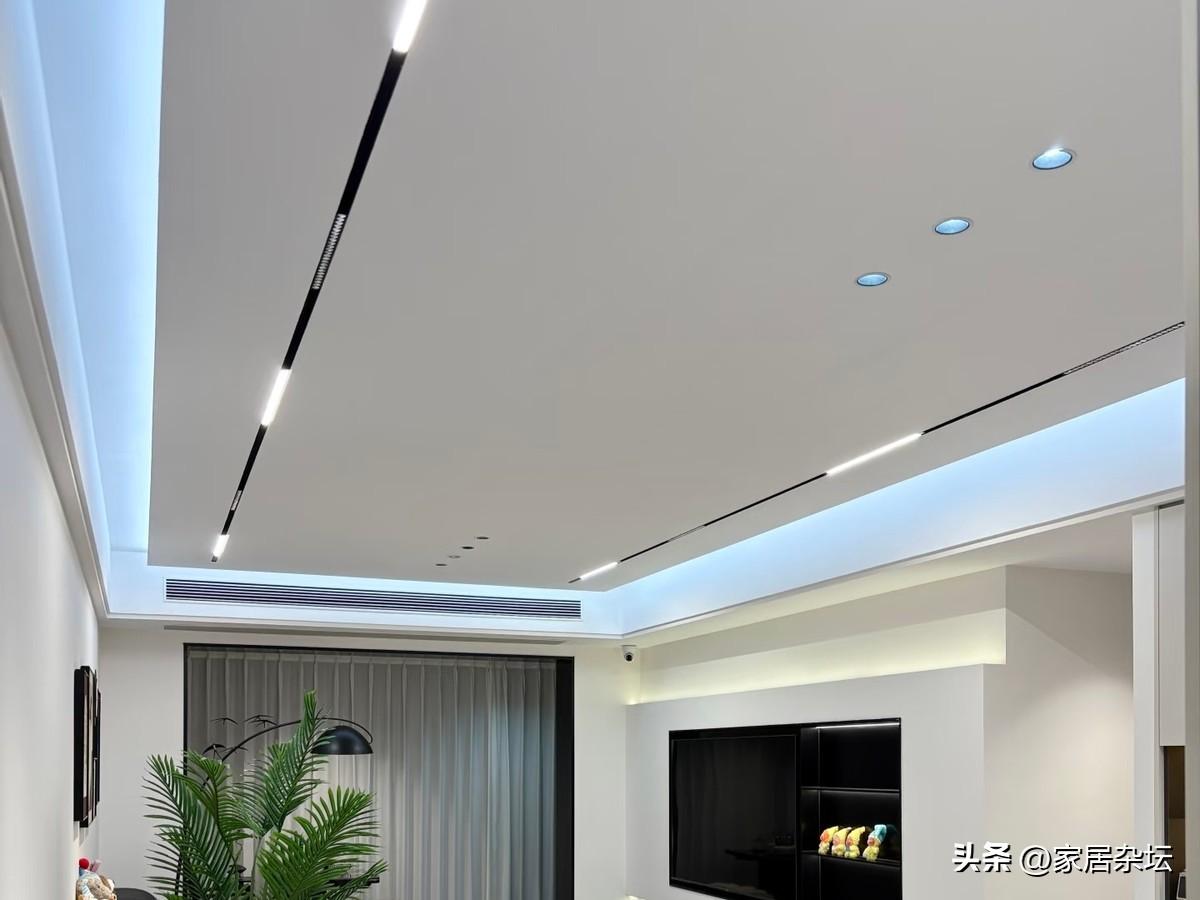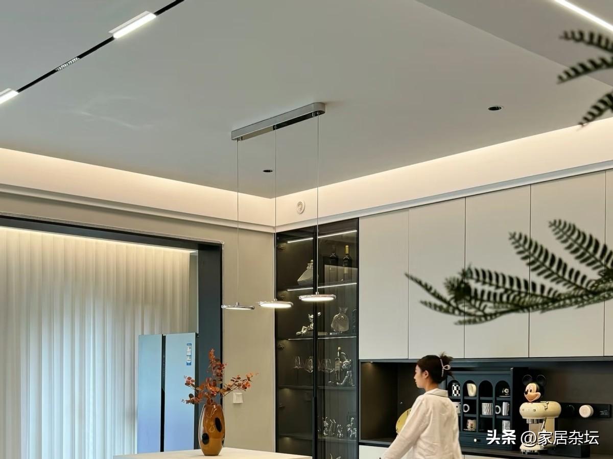這裏有個裝修細節,,就是客廳可以放棄傳統的大吊燈,安裝普通的磁吸軌道等,也可以隨意搭配移動各種筒燈射燈等等。