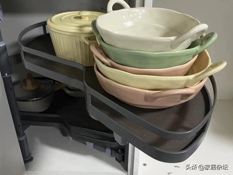 有一個裝修細節,就是在廚房轉角的位置,可以放棄傳統的隔板,取而代之的是安裝一個旋轉拉籃系統。