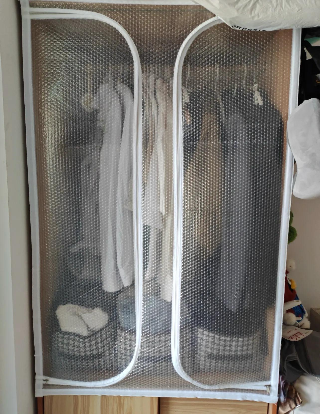 一般自帶魔術貼、拉鍊,固定在衣櫃邊框上,就能形成一個簡易的軟性櫃門。