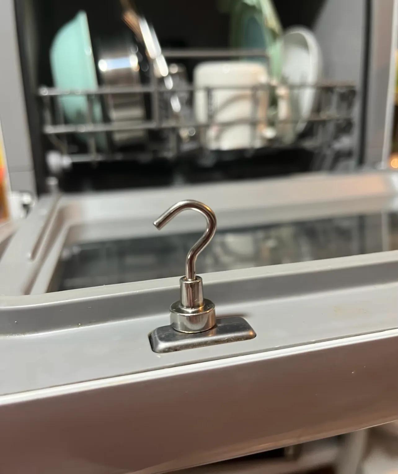 因爲洗碗機門本身就是磁鐵,用磁吸掛鉤一吸,就能把門固定在你想要的角度,既通風又節省空間。