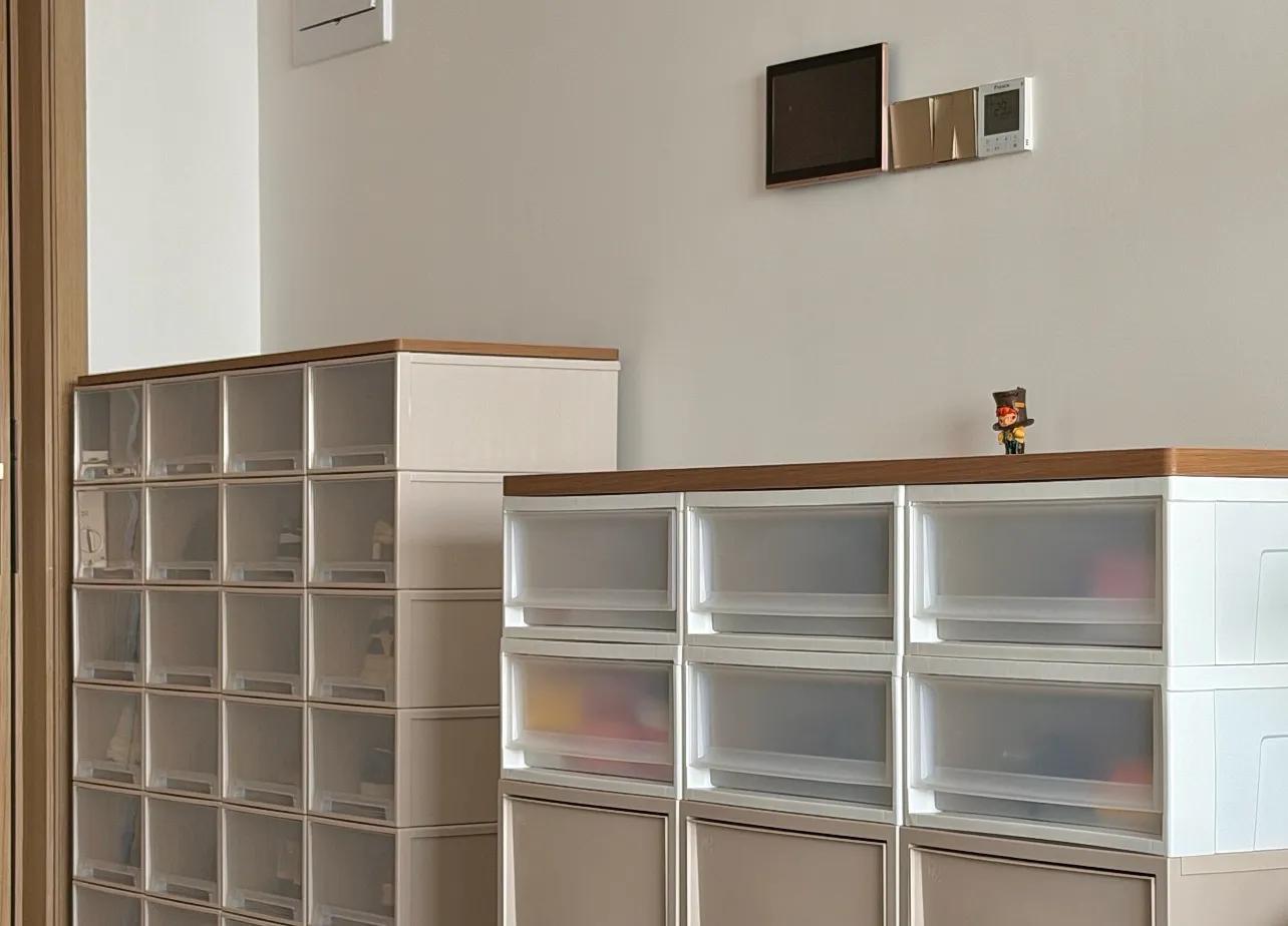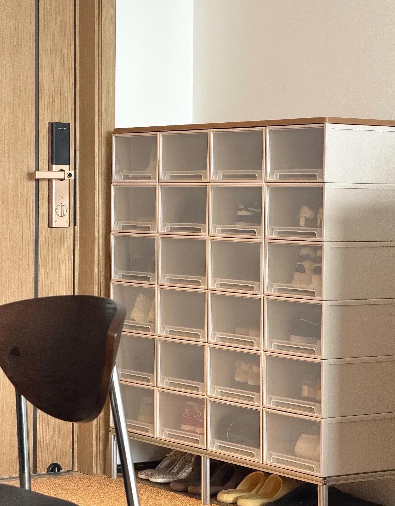 定製的鞋櫃,空間太死板,一個更靈活、能裝的方案是:抽屜式收納箱+增高架+木板。