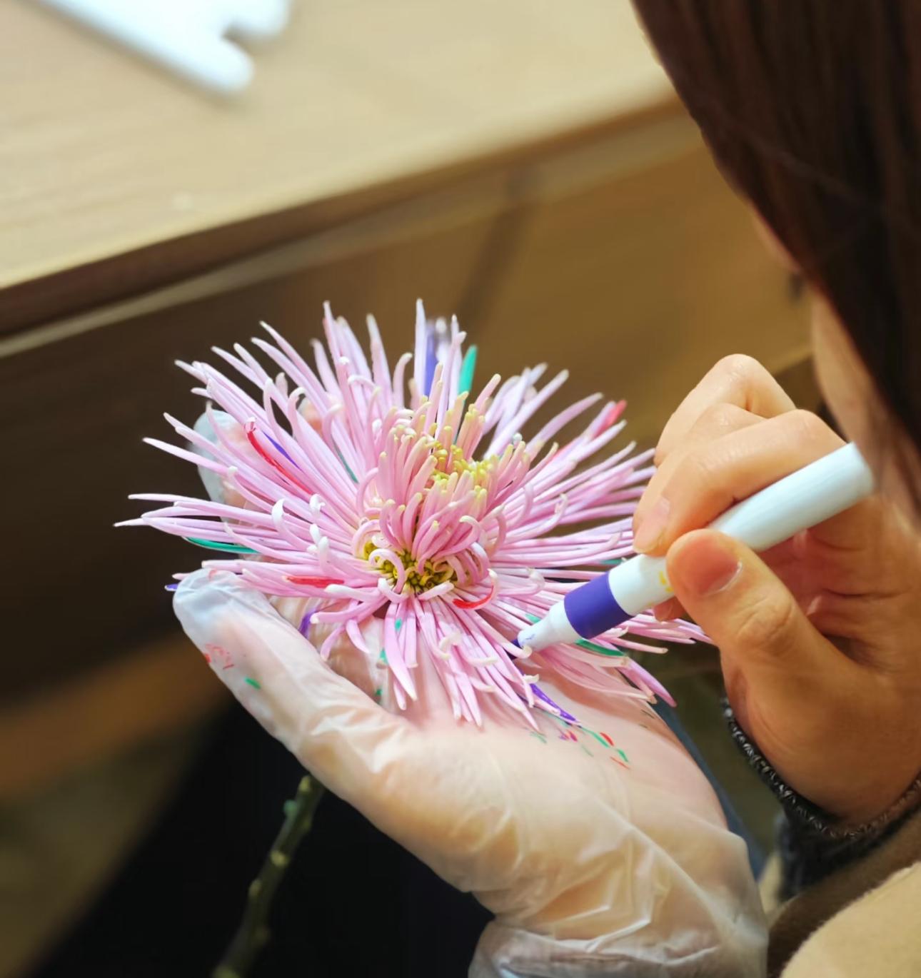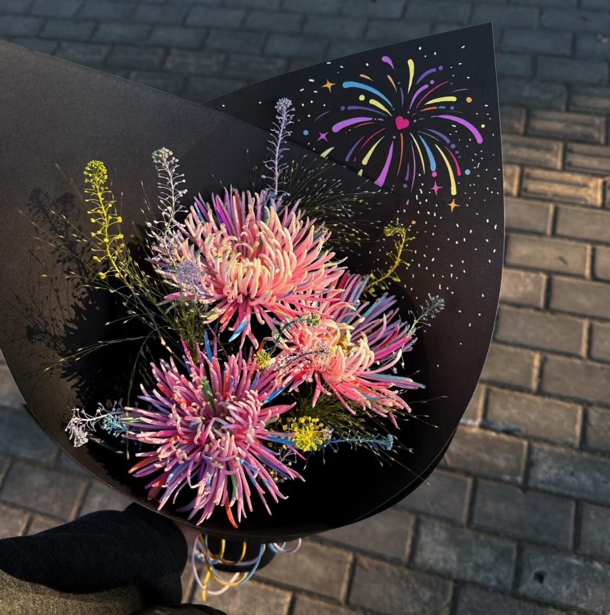 最後才知道,原來年輕人利用在菊花上彩噴、彩繪模仿煙花花束的法子,一時間成了年輕人過年互送新意的標配。