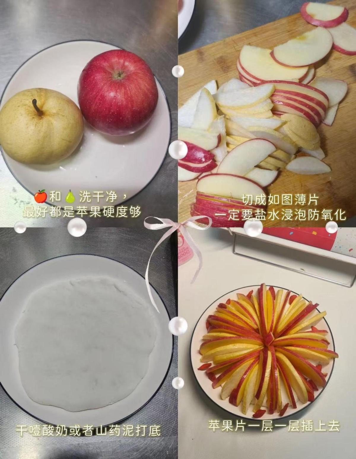 全部切好一片片錯落着、豎着往酸奶上插,蘋果就像煙花一樣綻開了,紅白相間特別好看。