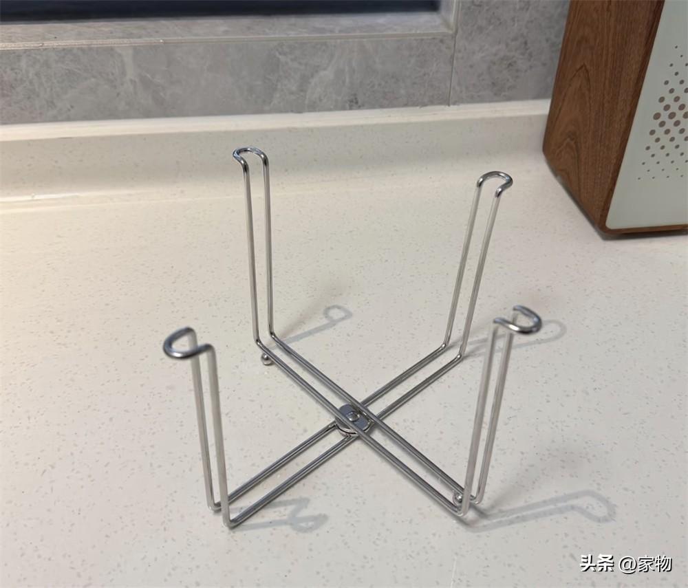 其實它就是個簡易式的、直接套垃圾袋的摺疊垃圾夾,不用的時候隨便塞到廚房的抽屜櫃格里,用到的時候拿出來放在臺面上,也完全不佔空間,偶爾當個杯子碗碟瀝水架也OK,非常實用。