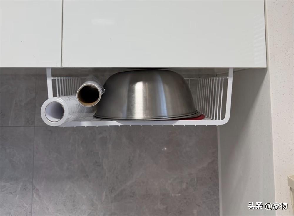 權衡再三,買了這種櫥櫃下沿收納架,只需要卡在吊櫃的櫃底,就可以收納保鮮膜保鮮袋或者一些經常用的碗碟不鏽鋼盆,乾淨利落,拿取方便。