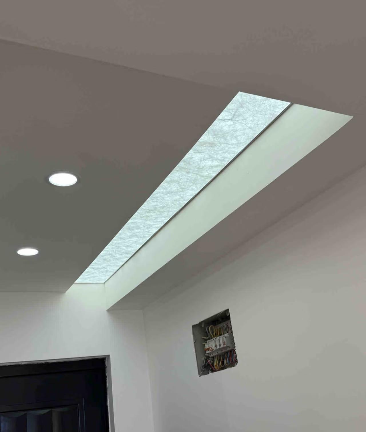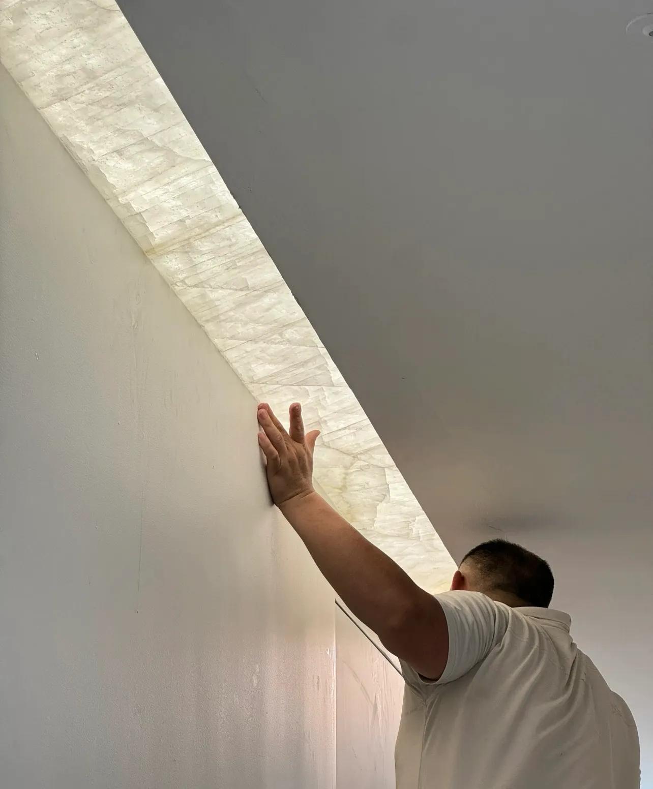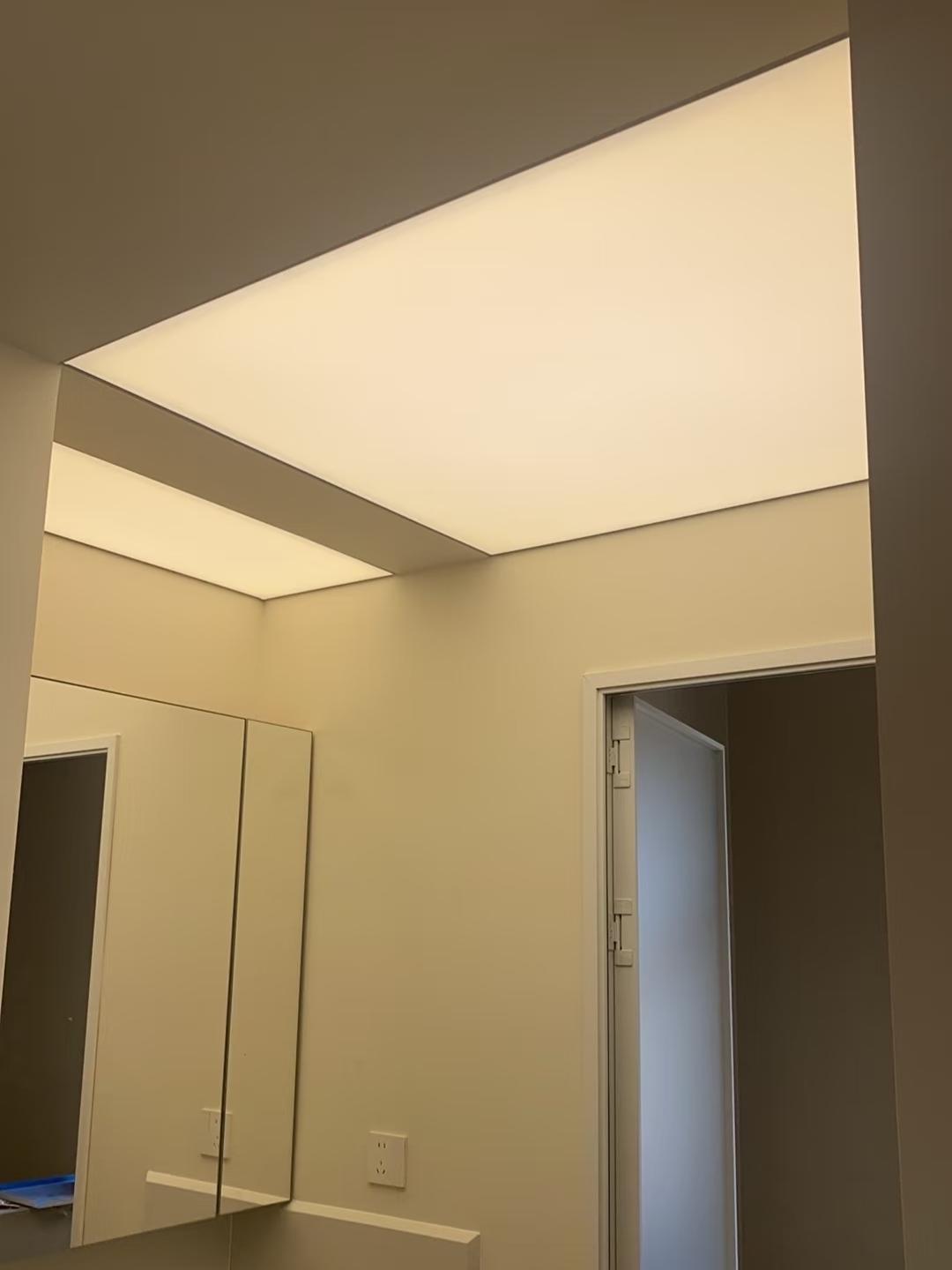 不過這麼做也很考驗技術,大理石需與鋼化玻璃夾膠處理,防開裂;天花四面要開槽,兩端還需額外加固;還要考慮到燈壞,要額外裝一組燈帶備用。