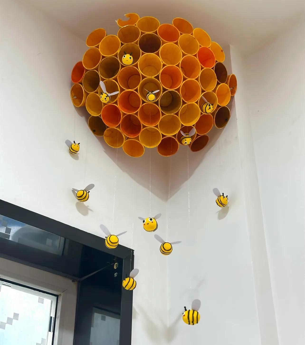 這很適合和孩子一起做手工,馬蜂是超輕黏土做的,蜂窩是用一次性紙杯,塗成深淺不同的黃色,很形象!最後可以用納米膠上牆。