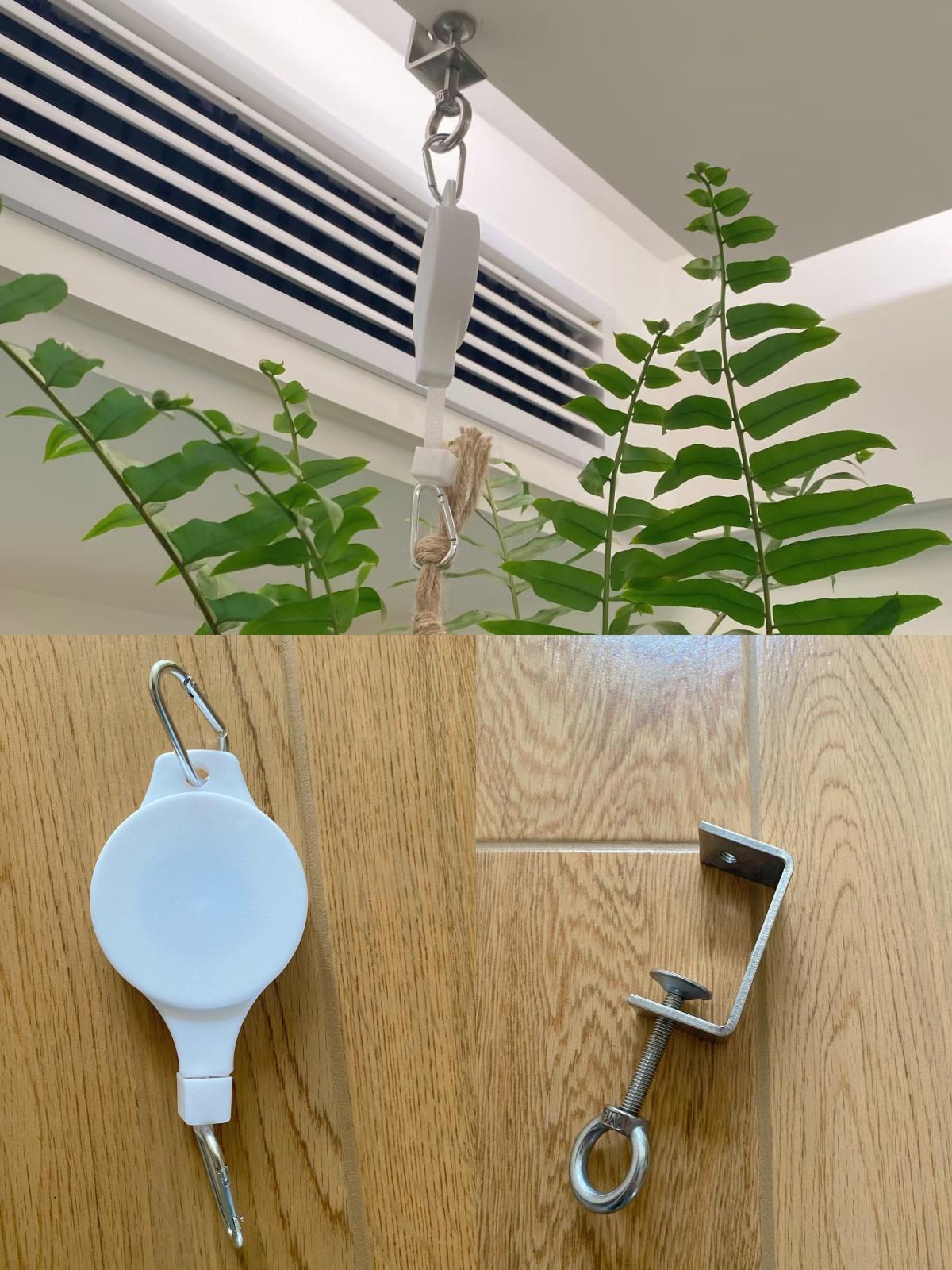 可以參考住友@金銀黑白灰的做法,工具用的是老虎夾+掛鉤,老虎夾固定在吊頂邊緣,中間用掛鉤連接,下方的花盆則用麻繩系在掛鉤上。