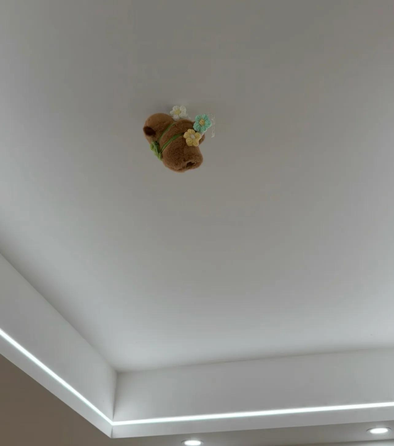裝修多預留了燈線,結果沒用上,裸着的電線太醜,這點活又不好找人幹,乾脆“扔”了個卡皮巴拉上天花板!
