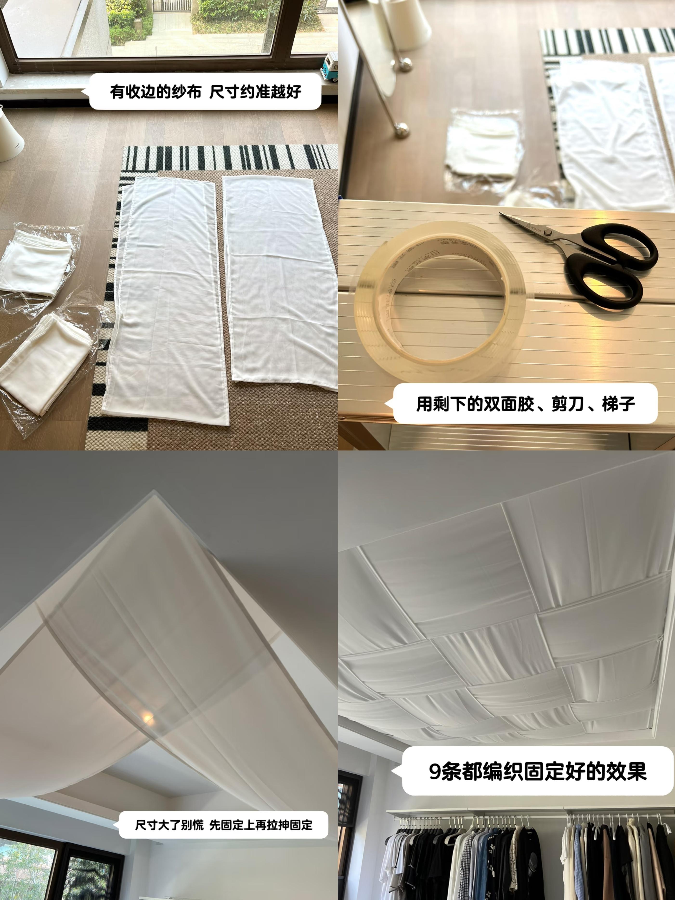 讓我們來跟着學一學:布料建議直接找店家定製,這裏用了4條橫幔+5條豎幔的組合;尺寸是實際吊頂內寬+5/10cm,如果想下垂感更明顯可以再長些,記得要讓店家收邊。