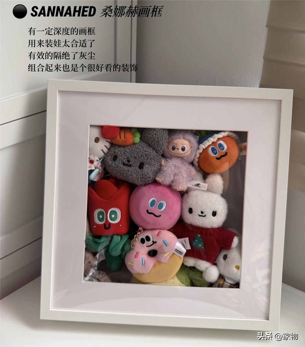 網上關於這畫框的DIY非常多,它本身帶一點深度,可以裝那種裝裱好的小幅畫作,也可以像我一樣,在裏面塞滿各種小小的毛絨玩具,變成一個可愛的防塵裝飾架,掛在牆上或者直接放在桌臺上都不違和哦~