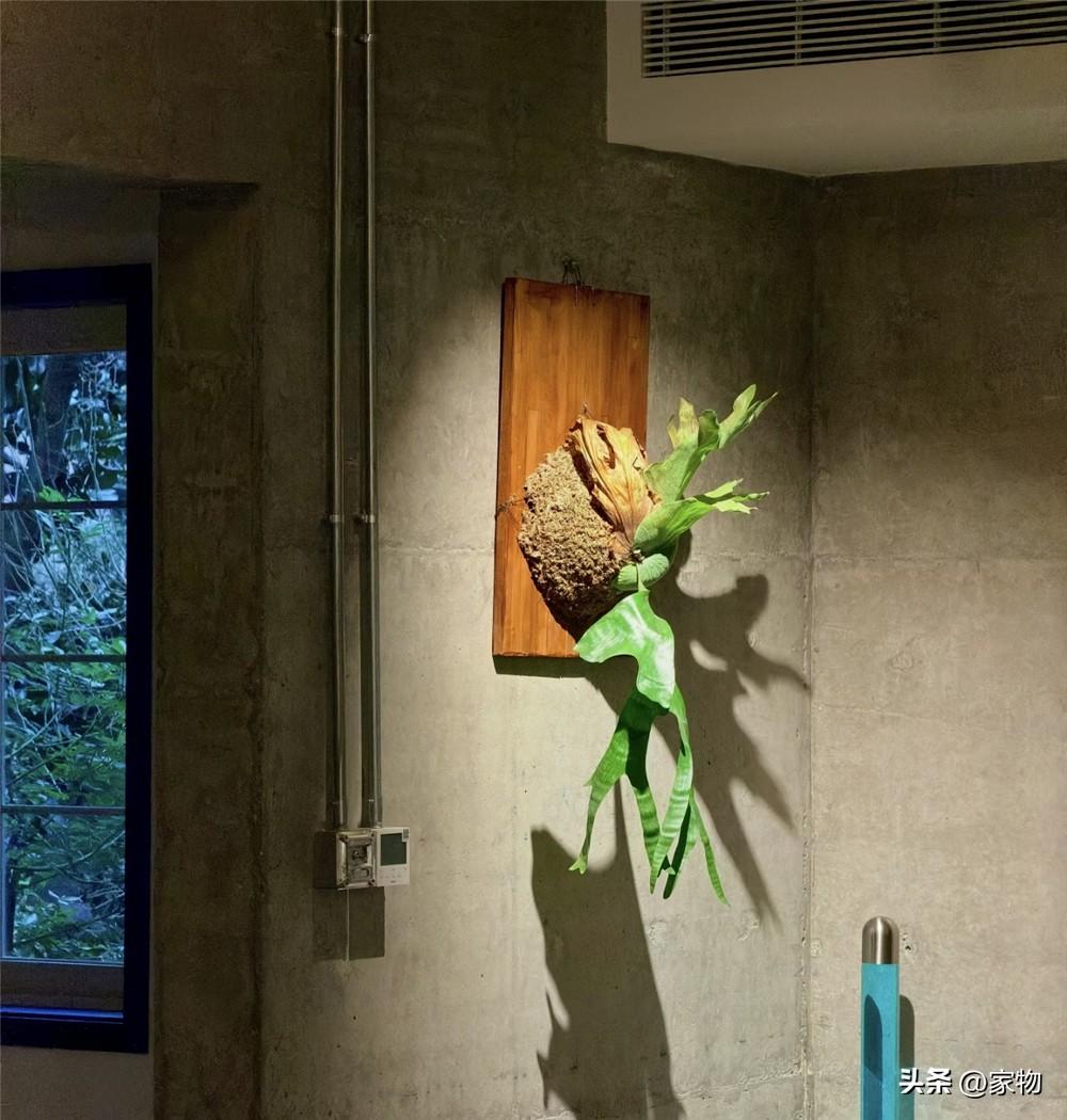 這半牆的位置,同樣是水泥管線的毛坯風格,但卻恰到好處掛上了一株鹿角蕨,在射燈的照耀下,投射出斑駁陰影,光影交織間,既給客廳空間帶來了高級感,又讓這一抹綠意消融了水泥牆面的冰冷色彩,這審美真是沒話說。