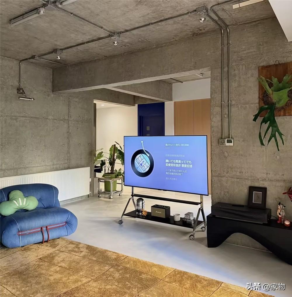 雖說沒有電視牆,但卻能用支架電視代替,這金屬色澤的鐵藝支架,和家裏的水泥毛坯風格十分相符,再加上它可以隨意移動到客廳餐廳或家裏其他位置,用起來也會比普通的壁掛電視靈活許多。