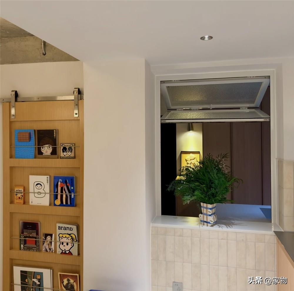 廚房內有一扇朝向臥室的內窗,摺疊起來後幾乎是全開,它旁邊的雜誌架,也並非只是裝飾,而是一扇穀倉式移門,拉開後同樣可以通往臥室。