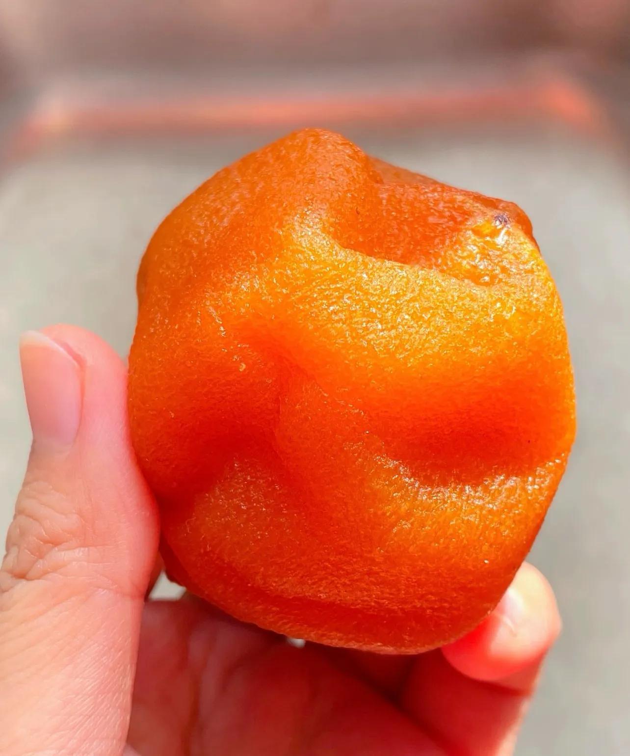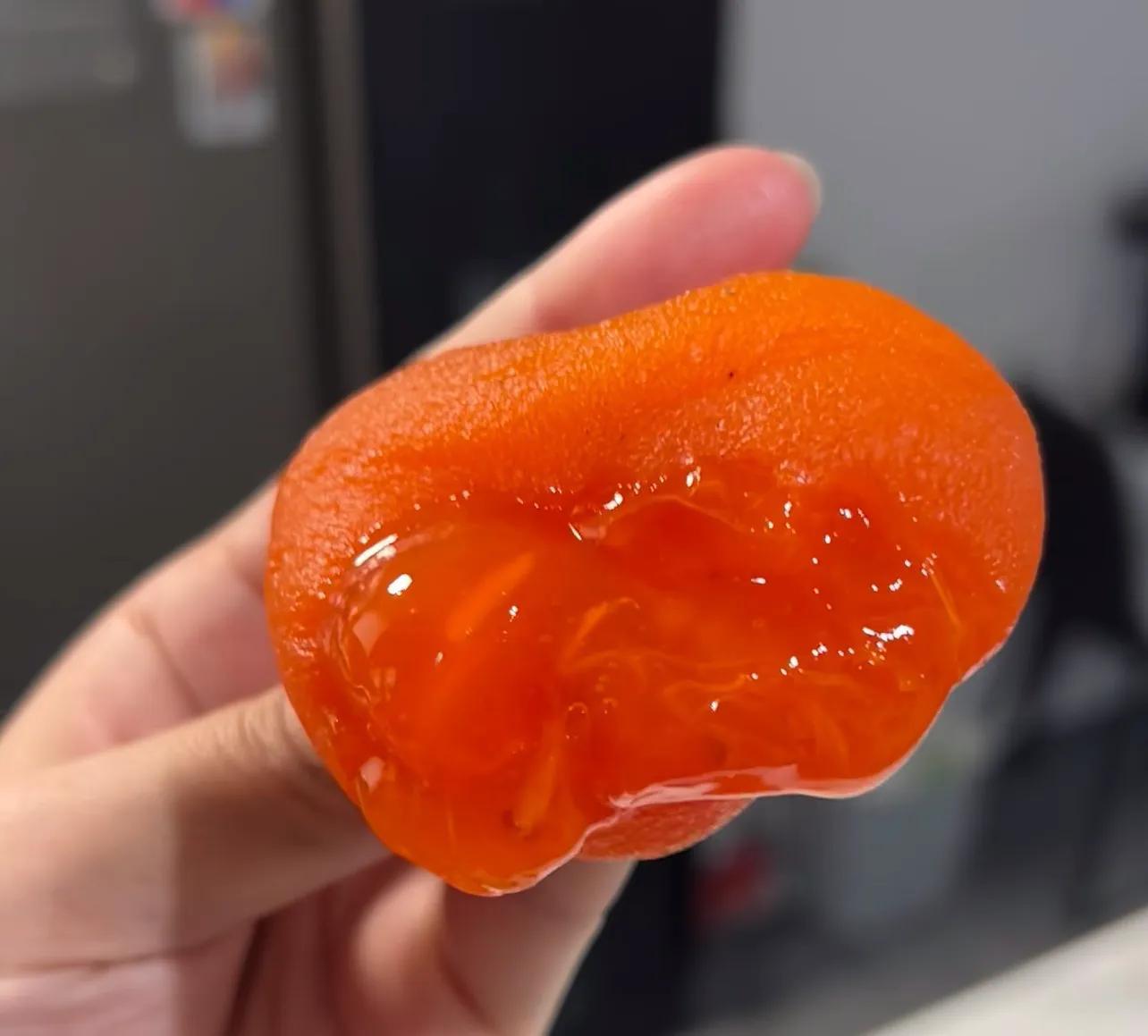 外面是哏啾啾的,糯嘰嘰QQ彈彈的,裏面是非常甜的、果味非常濃郁的、冰冰涼涼的柿子流心(冰箱存儲的),就真的賊好喫!!!