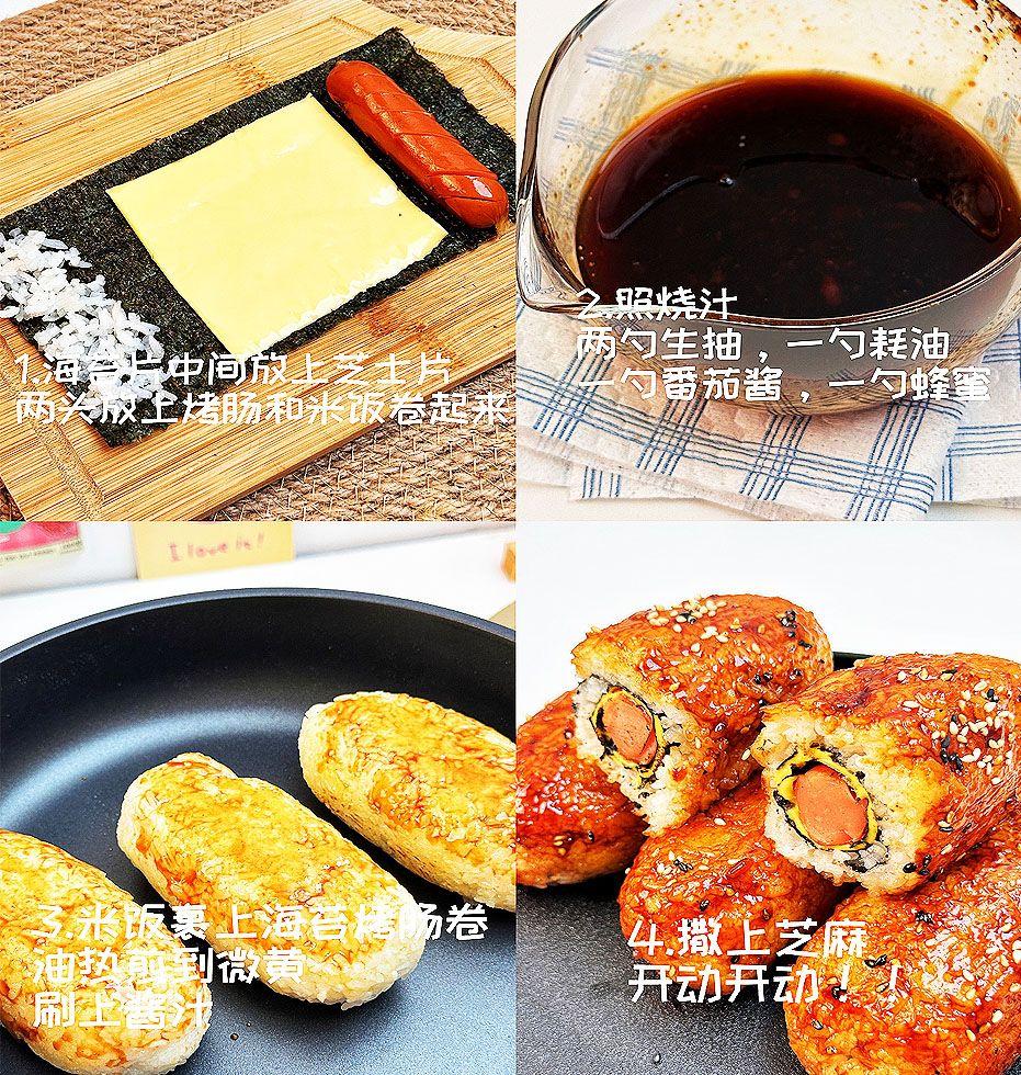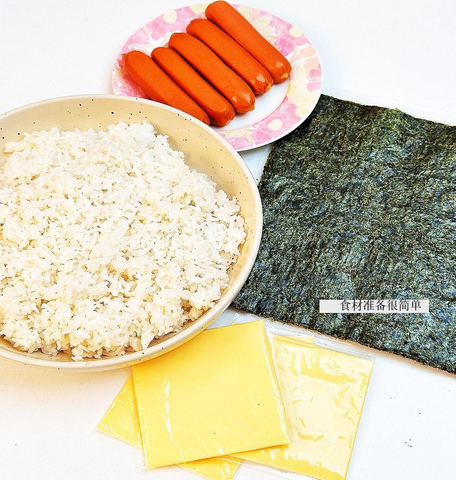 做法類似於做壽司,米飯+海苔+澱粉腸+芝士,只不過需要一步煎的過程。