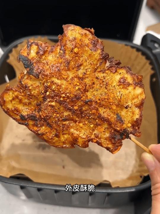 烤起來也很簡單:壓好的土豆片噴點油,送進空氣炸鍋,180度15分鐘,中途翻面;接着刷上一層喜歡的醬,撒燒烤料,繼續烤2分鐘,出鍋。