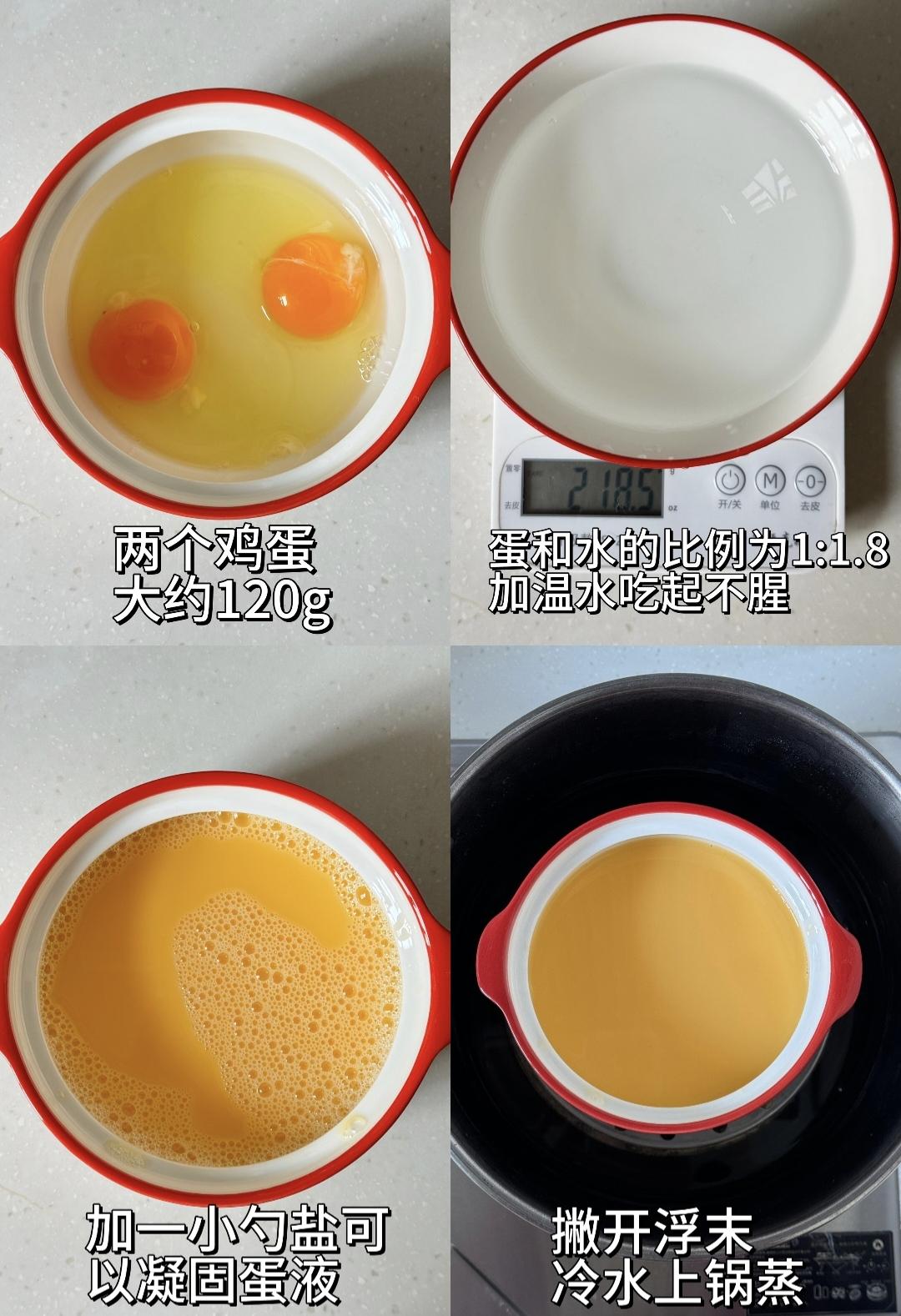 而滑嫩的關鍵,首先,是蛋與水的比例(如圖所示)、溫水、加鹽、以及撇乾淨浮沫;