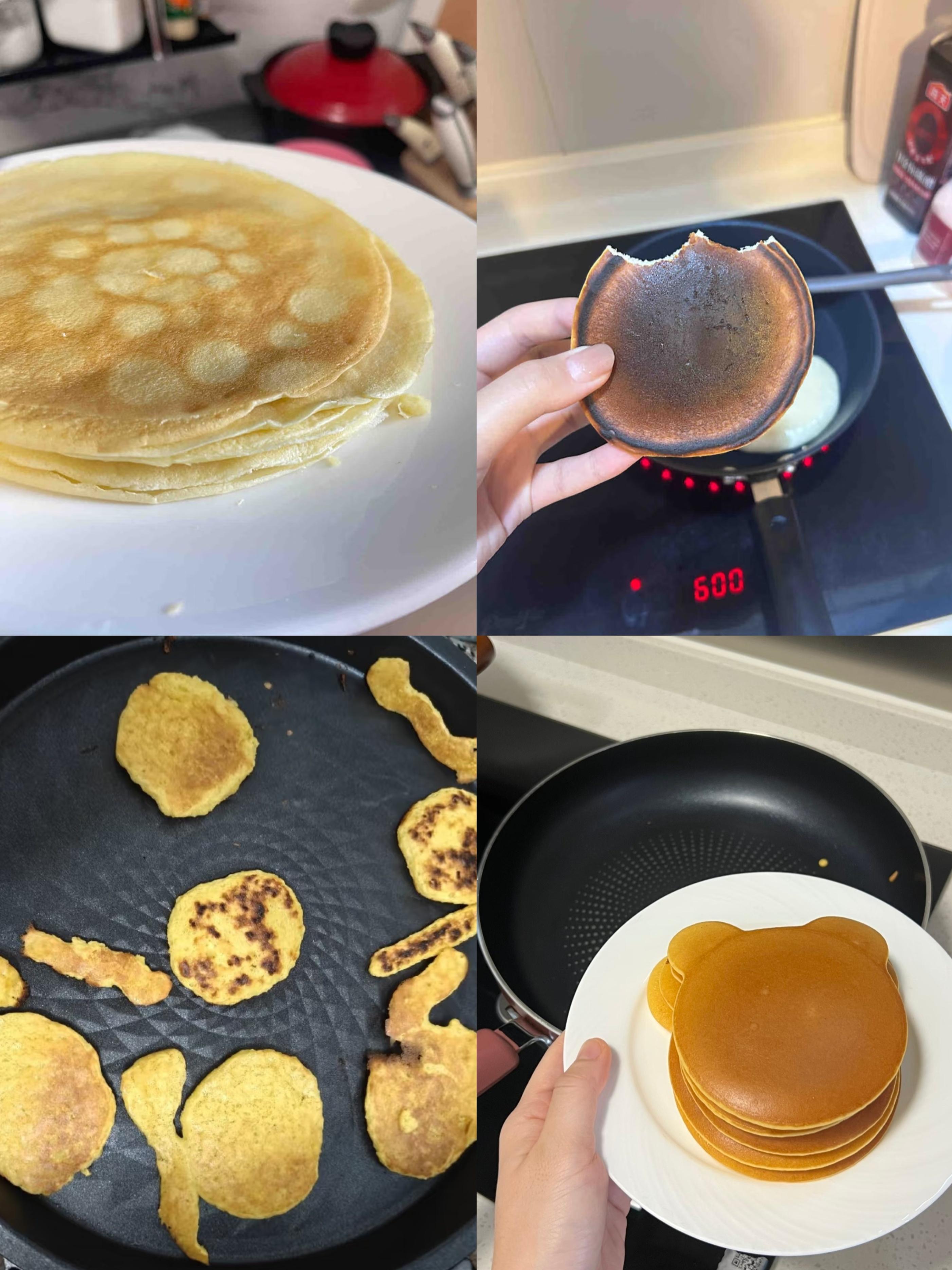 不怕大家笑話,下圖中,上左、上右、左下,全是我做鬆餅的翻車圖鑑,但,皇天不負有心人,靠着最終的“救命配方”,我成功了!