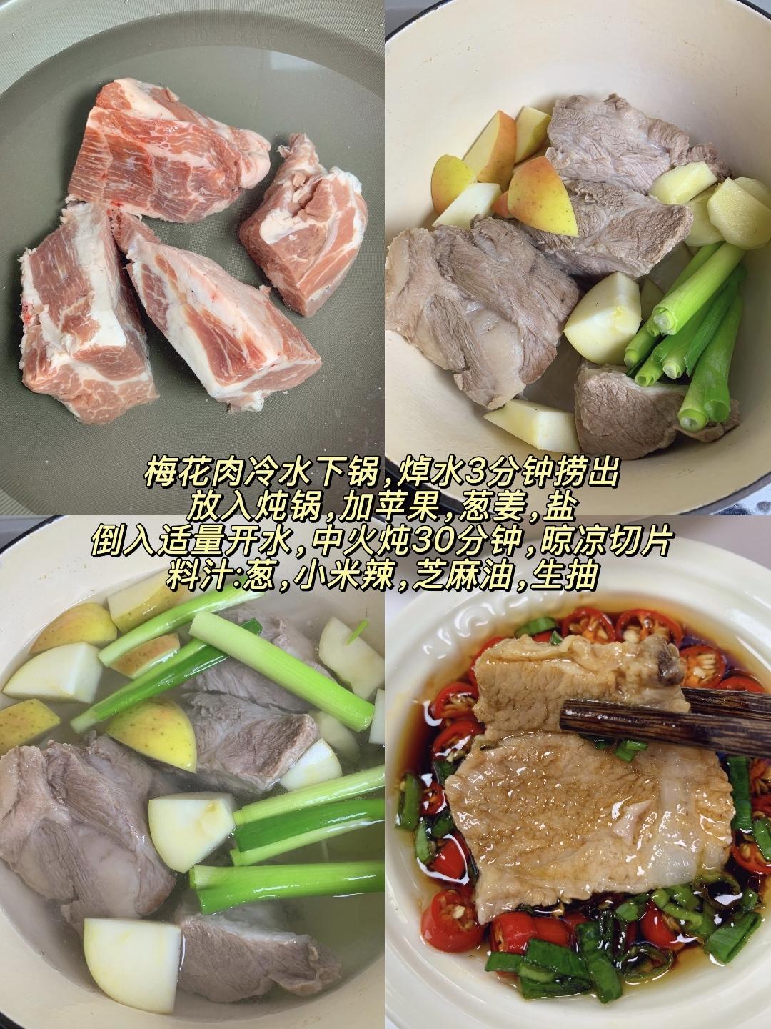 那用來做白切,也是對食材本味的至高禮遇。將洗好的梅花肉整塊冷水下鍋,焯三分鐘撈出,衝淨雜質;接着換鍋燉煮,加蘋果、蔥姜、鹽,以及開水,中火燉半小時左右,晾涼切片,開喫。