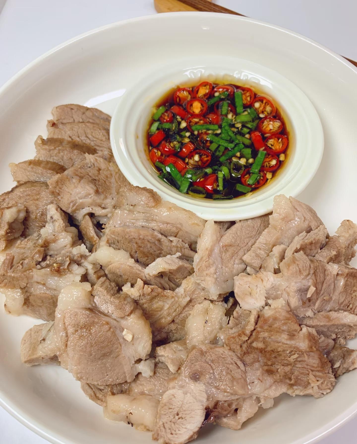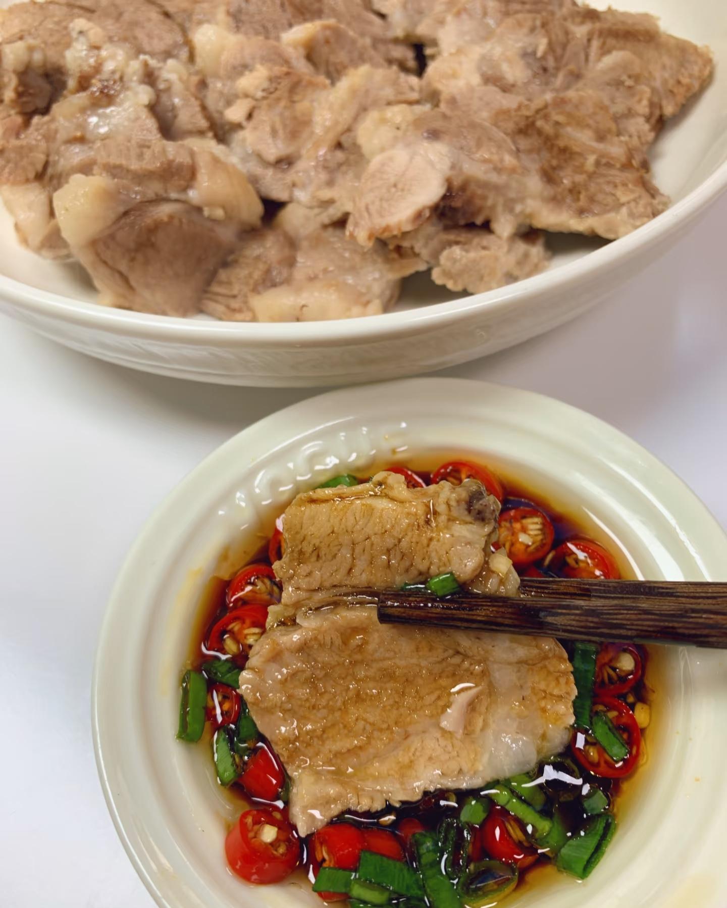 別忘了調一個蘸料:蔥花、小米辣、生抽、香油、再搗上一勺蒜泥,喫多了重口的,覺得偶爾喫喫白切肉,也相當不錯!