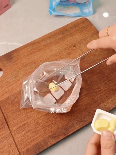 ②同時,把一塊黃油裝進封口保鮮袋,放進熱水裏熱化;