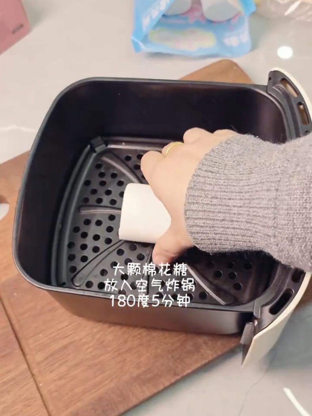 ①先把一顆大棉花糖,放進空氣炸鍋,烤180度5分鐘;