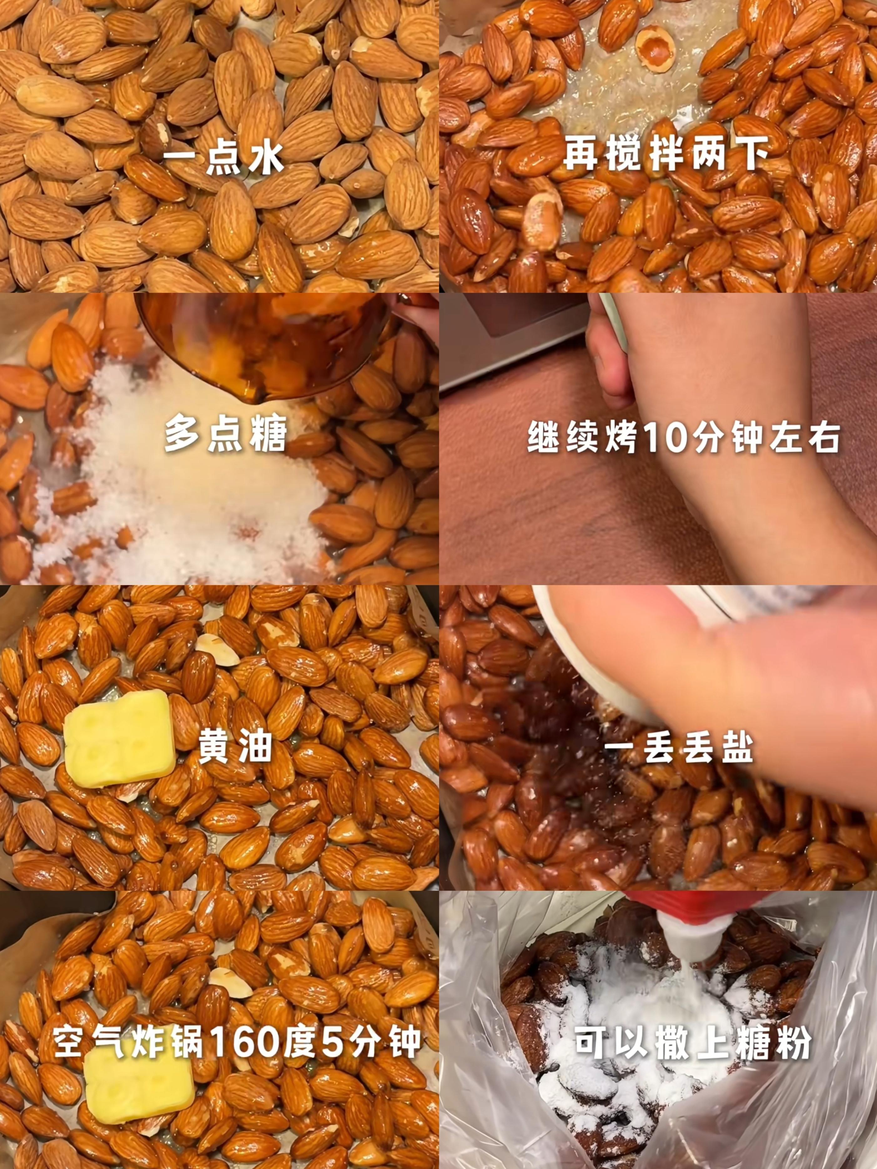 來看具體做法:在空氣炸鍋裏墊張烘焙紙,鋪滿巴旦木,加一點水,多點糖,是的,熱量有點罪惡,但糖少了真不是那味兒!