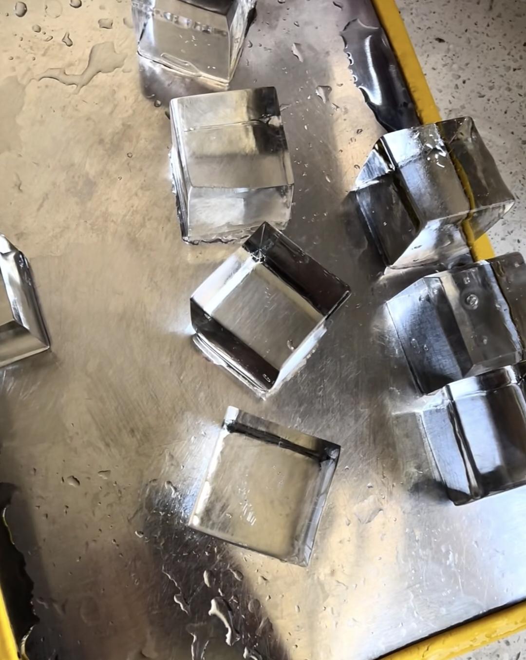 這就是“慢凍”對於高透冰的重要性,用保溫箱就是爲了減緩冷凍速度,只有足夠慢,空氣和雜質纔有足夠時間被排擠到冰塊底部,切掉就是晶瑩剔透的部分了。